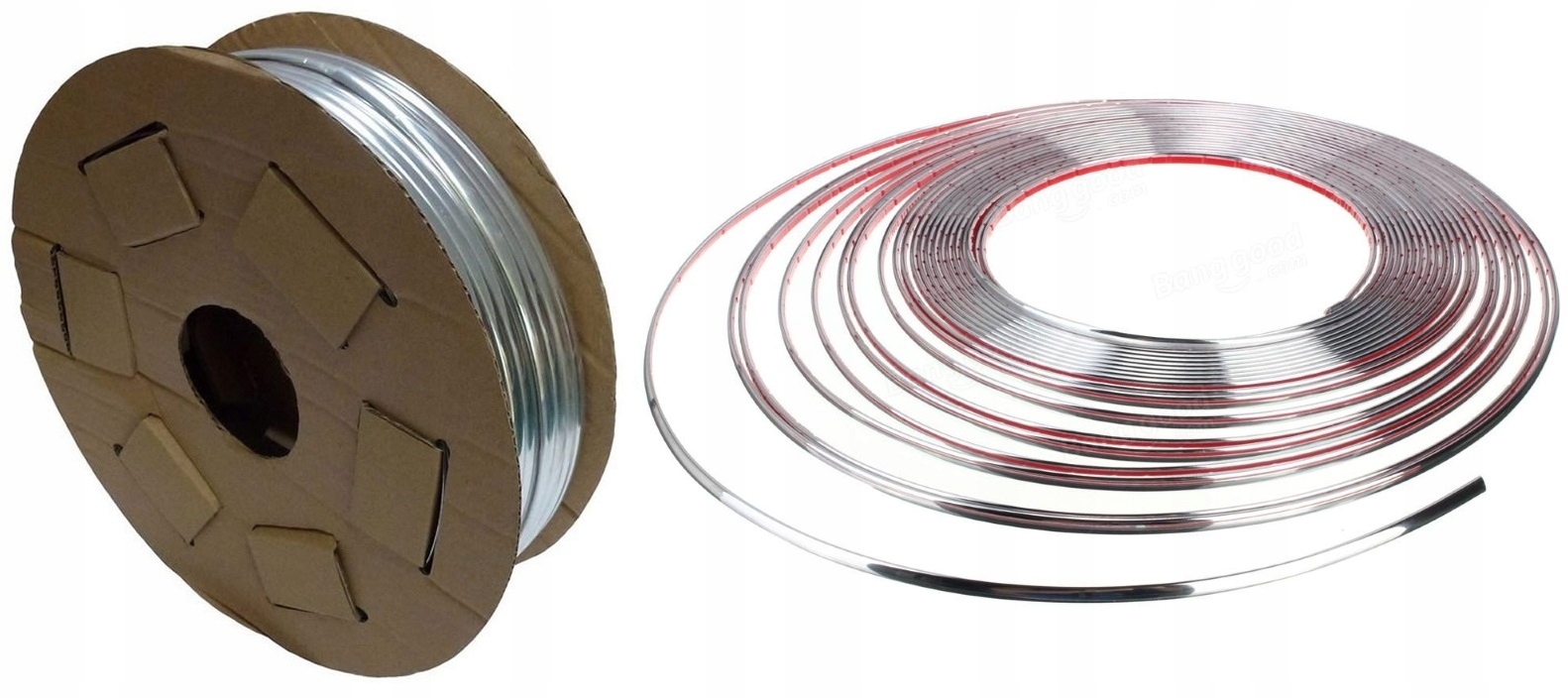 На аукционе представлена хромированная полоса шириной 6 мм и толщиной 2 мм (с двусторонним скотчем) - всего 100 метров в одном куске.