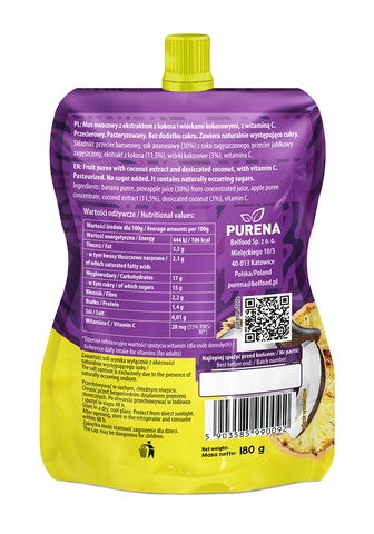 Состав: Банановое пюре, ананасовый сок (30%) из концентрированного сока, яблочное пюре, экстракт кокоса ( 11,5 %), кокосовая стружка (3 %), витамин С