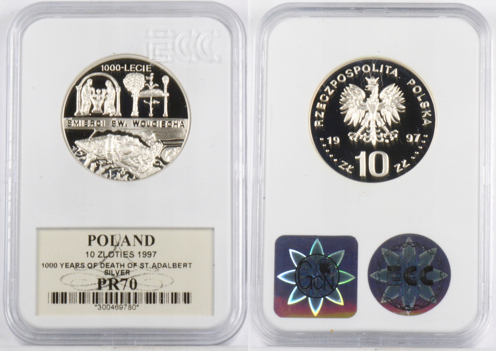 ХС. 10 ЗЛОТЫХ 1997 ГОДА 1000 ГОДОВЩИНЫ СО СМЕРТИ СВЯТОГО. ВОЙЦЕХА PR70 4/11
