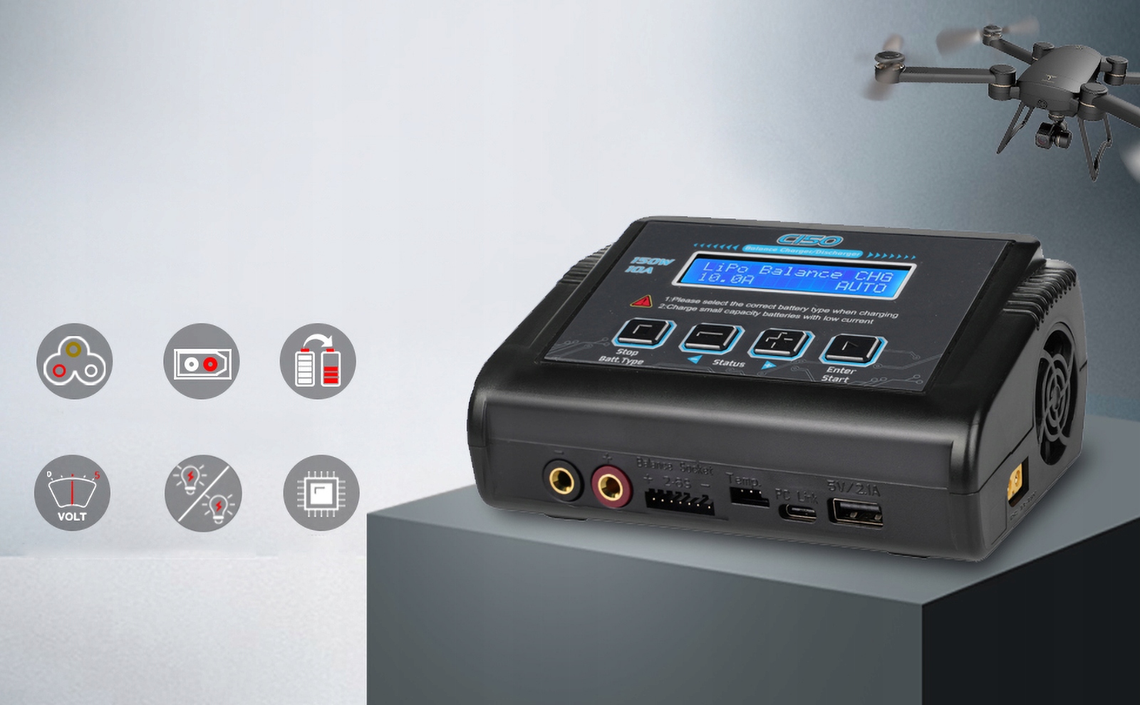 【Поддерживает широкий спектр аккумуляторов】LiPo 1–6S (3,7–22,2 В); Li-Ion 1-6S (3,6–21,6 В), LiFe 1-6S (3,3–19,8 В), LiHV 1-6S (3,8–22,8 В); NiMH/NiCD 1-15S (1,2–18 В); аккумулятор ПБ 2-20В; Smart Battery II/III/III (требуется дополнительный зарядный кабель DJI). Зарядное устройство C150 RC отвечает всем вашим потребностям в зарядке батарей RC.