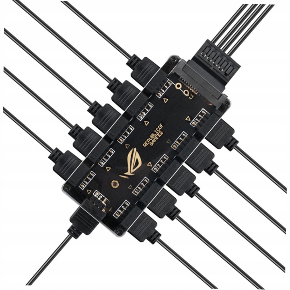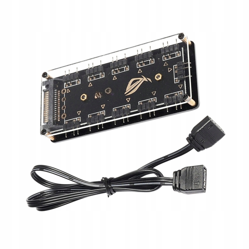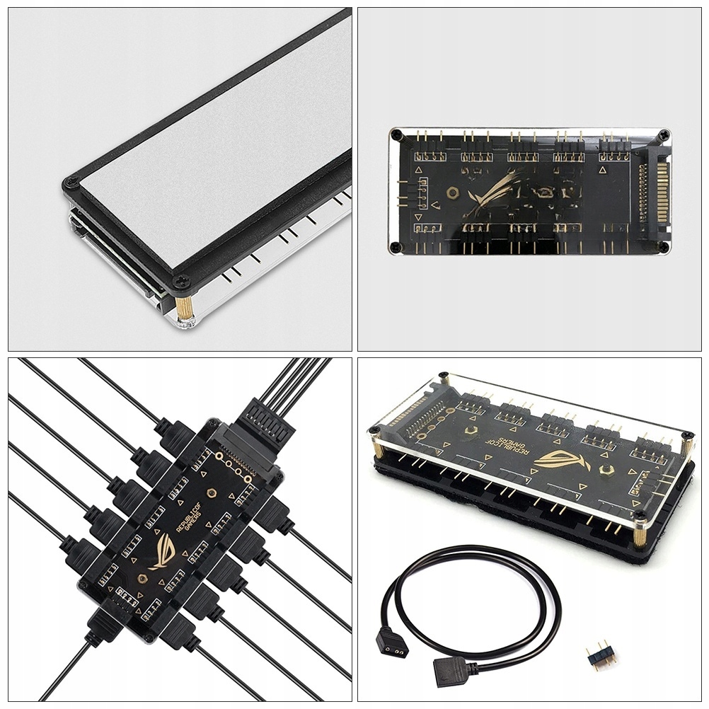 Hub/Spliter Sata 12x Argb 3pin 5V. Он может отправлять сигналы максимум двенадцати элементов ARGB. Он совместим с элементами ARGB с 3-контактным разъемом ARGB. Питание взято из порта SATA. Продукты ARGB, такие как освещение вентилятора, светодиодные полосы ARGB и освещение водяного охлаждения, могут быть подключены к коллектору. На задней части адаптера есть самостоятельная лента, которая легко и безопасно приклеить тарелку к корпусу компьютера. Набор включает в себя кабель ARBB для подключения к материнской плате