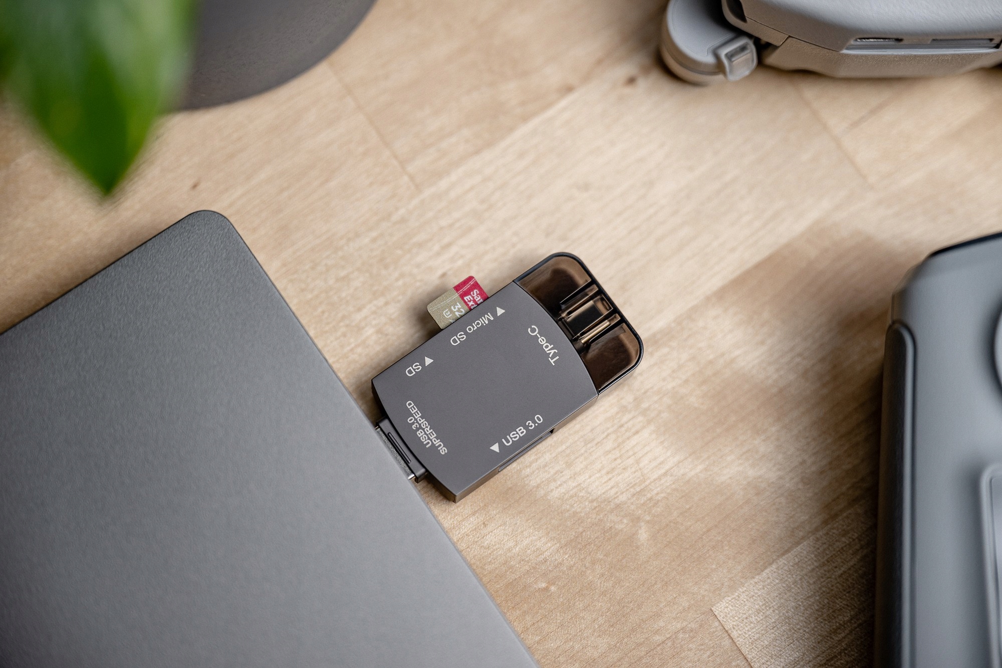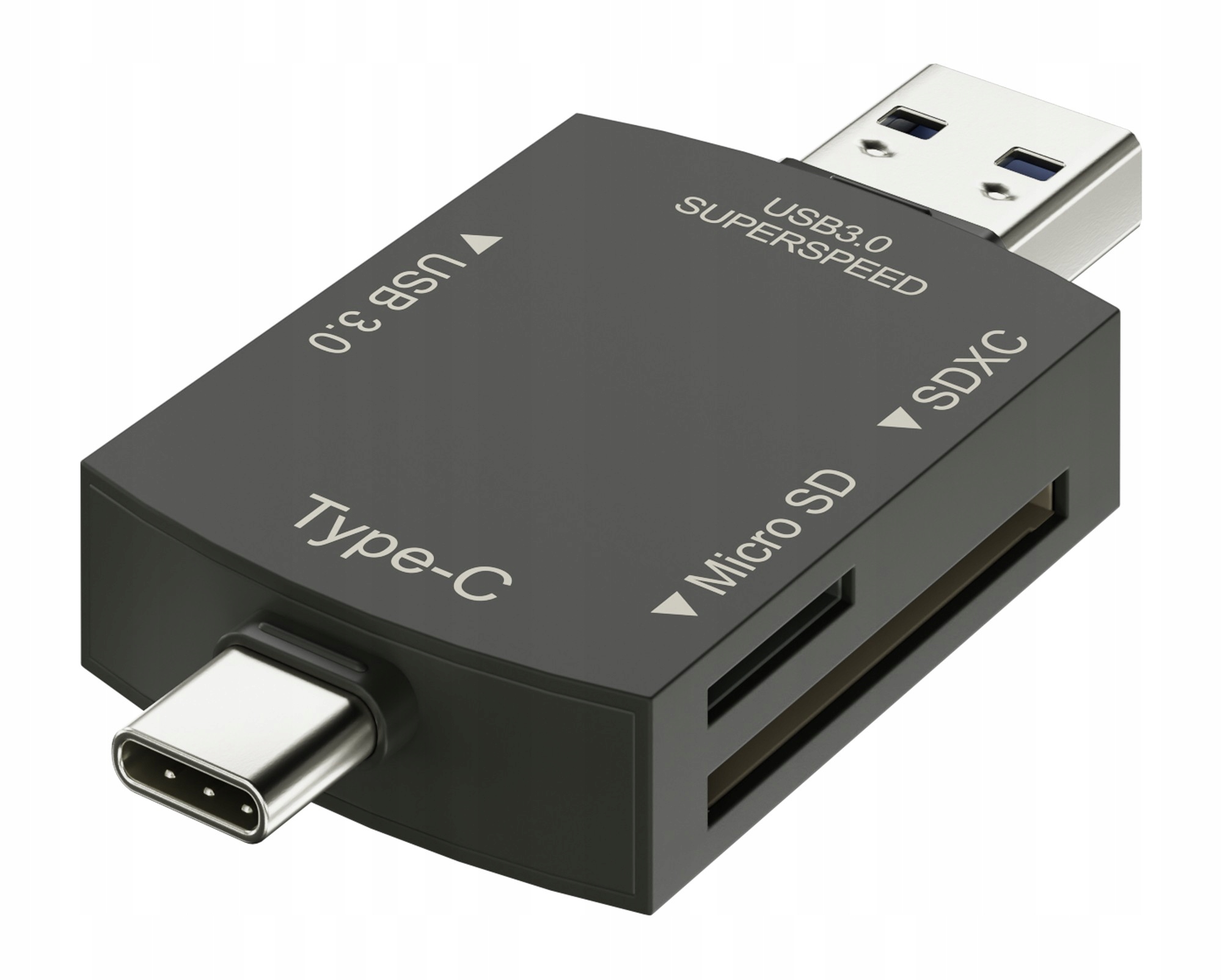 hub newell Otg 3 в 1 - универсальный считыватель карт памяти, который напоминает зажигалку с его размерами. Устройство оснащено 2 Plugs-USB-A и USB-C. Благодаря поддержке технологии OTG HUB, вы можете подключиться не только к компьютеру, но и к смартфону или планшету. Это не требует установки каких -либо дополнительных драйверов или приложений. Был также розетка USB 3.0 на корпусе. Максимальная скорость передачи данных составляет 5 ГБ/с. Читатель поддерживает 2 типа карт памяти - Micro SD и SD. Корпус, изготовленный из алюминиевого сплава и заглушек -в заглушках гарантирует долговечность и адекватную защиту устройства