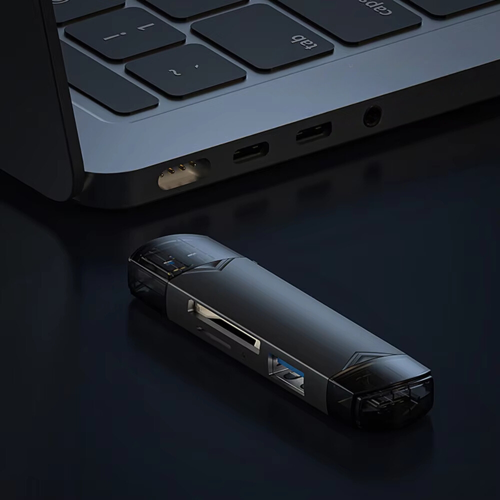 Это универсальное устройство чтения карт памяти сочетает в себе множество функций, обеспечивающих быструю и удобную передачу данных. Благодаря трем интерфейсам - USB 3.0, USB-C и скрытому разъему MicroUSB, встроенному в USB-порт - это обеспечивает широкий спектр b>совместимости с различными устройствами: от компьютеров и ноутбуков до смартфонов и планшетов. Поддерживает популярные форматы карт, такие как SD, MicroSD, SDHC, SDXC, MicroSDHC ,MicroSDXC. Кроме того, устройство имеет возможность подключения флешки и имеет ручку для крепления шнурка или насадки, что обеспечивает удобство переноски и снижает риск потери. Алюминиевый корпус обеспечивает долговечность, а встроенные крышки разъемов защищают их от повреждений.