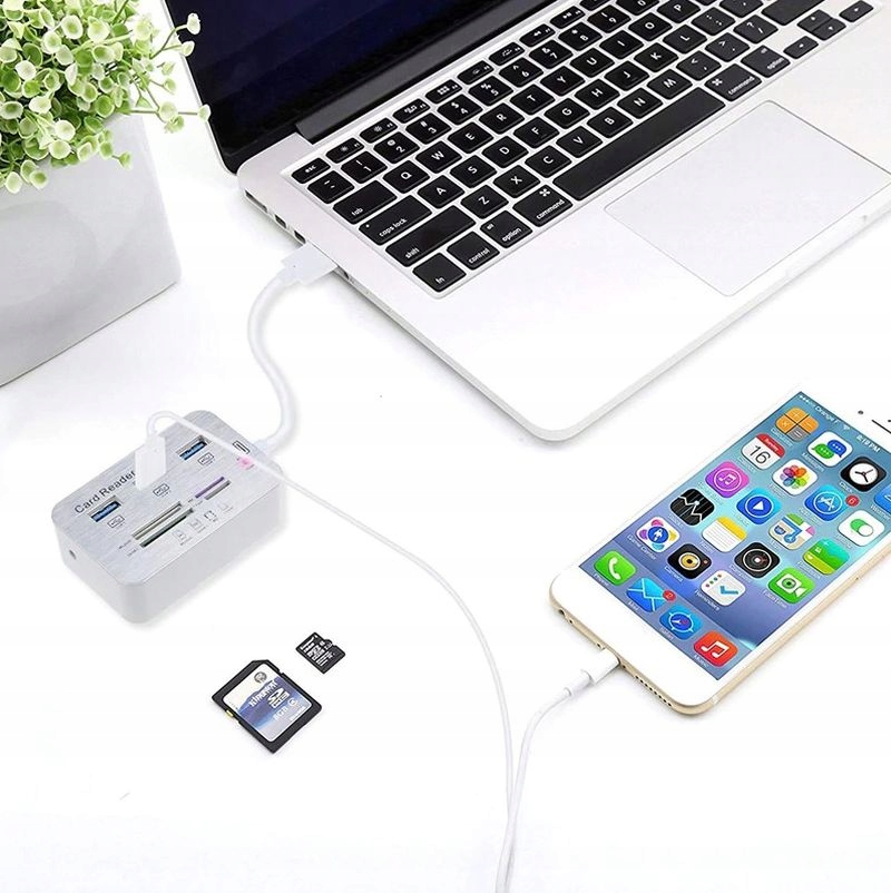Универсальное устройство чтения карт памяти «все в одном» с тремя концентраторами USB3.0. Поддерживает 4 типа карт памяти SD/MMC, TF/MicroSD, M2, MS/MS ProDuo. Хаб/ридер подключается к компьютеру через встроенный кабель USB3.0. Благодаря USB 3.0 вы можете достичь гораздо более высокой скорости передачи данных — до 5 Гбит/с.