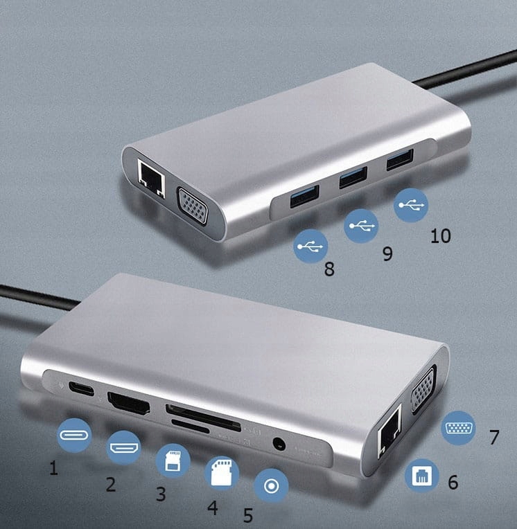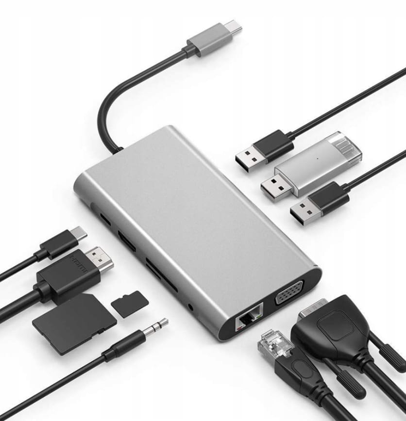Hub USB-C Адаптер 11W1 с портами: HDMI 4K, VGA, 3X USB 3.0, SD и Micro SD, Mini Jack, Gigabit Ethernet, Power Delivery H1>