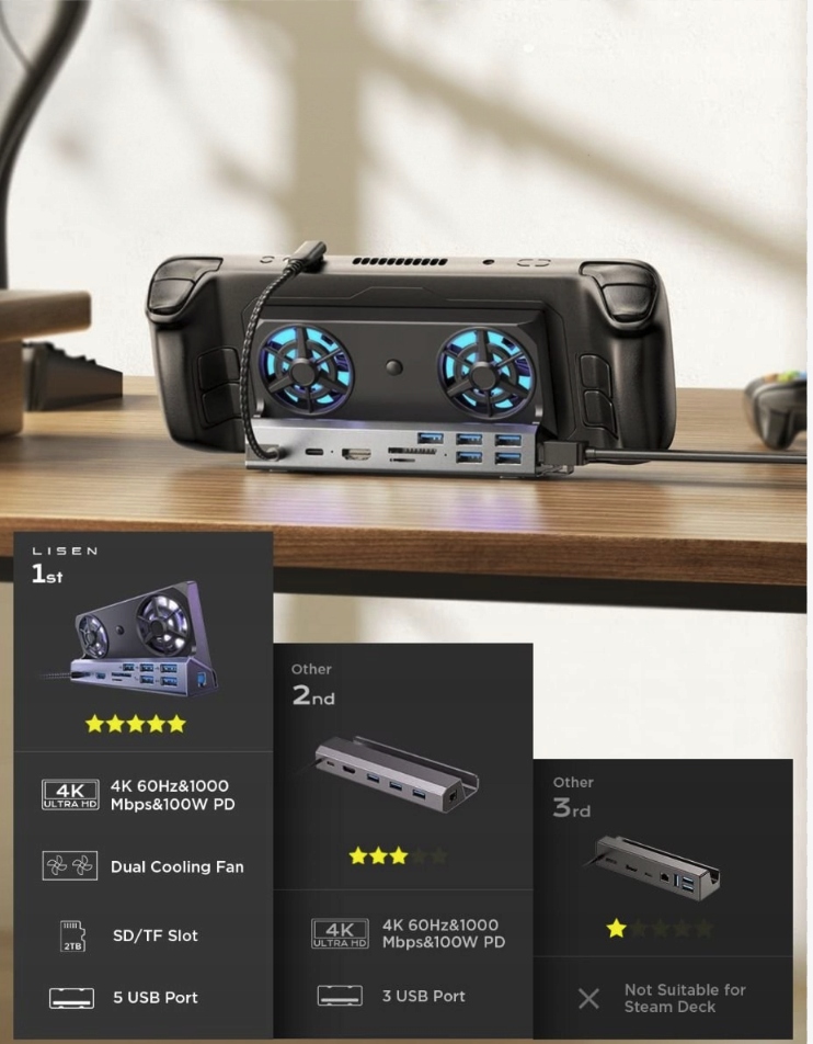 По многочисленным тестам на YouTube, это, пожалуй, лучшая док-станция такого типа для новейших портативных консолей Steam Deck и Asus ROG Ally.