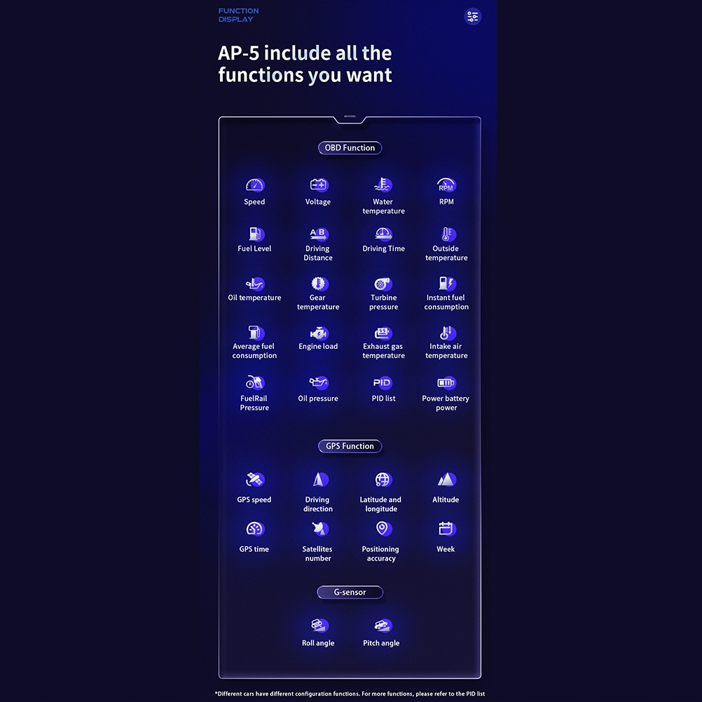 Режим OBD2: скорость, напряжение, температура воды, скорость, количество топлива, время вождения, пробег, температура наружного воздуха, температура моторного масла, температура масла в коробке передач, турбодавление, мгновенный расход топлива. , средний расход топлива, нагрузка на двигатель, температура выхлопных газов, температура впускного воздуха, давление топлива, давление масла, список PLD, заряд аккумулятора;
