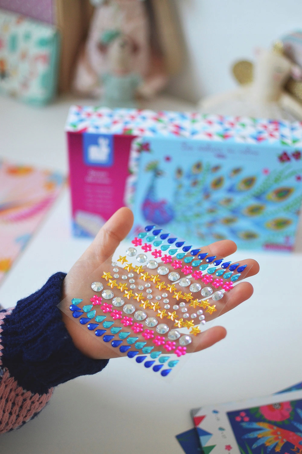 Креативный набор Волшебные стразы Красивые птицы от французского бренда JANOD содержит 3 фотокарточки с восхитительными красочными изображениями: павлин, колибри и попугай.