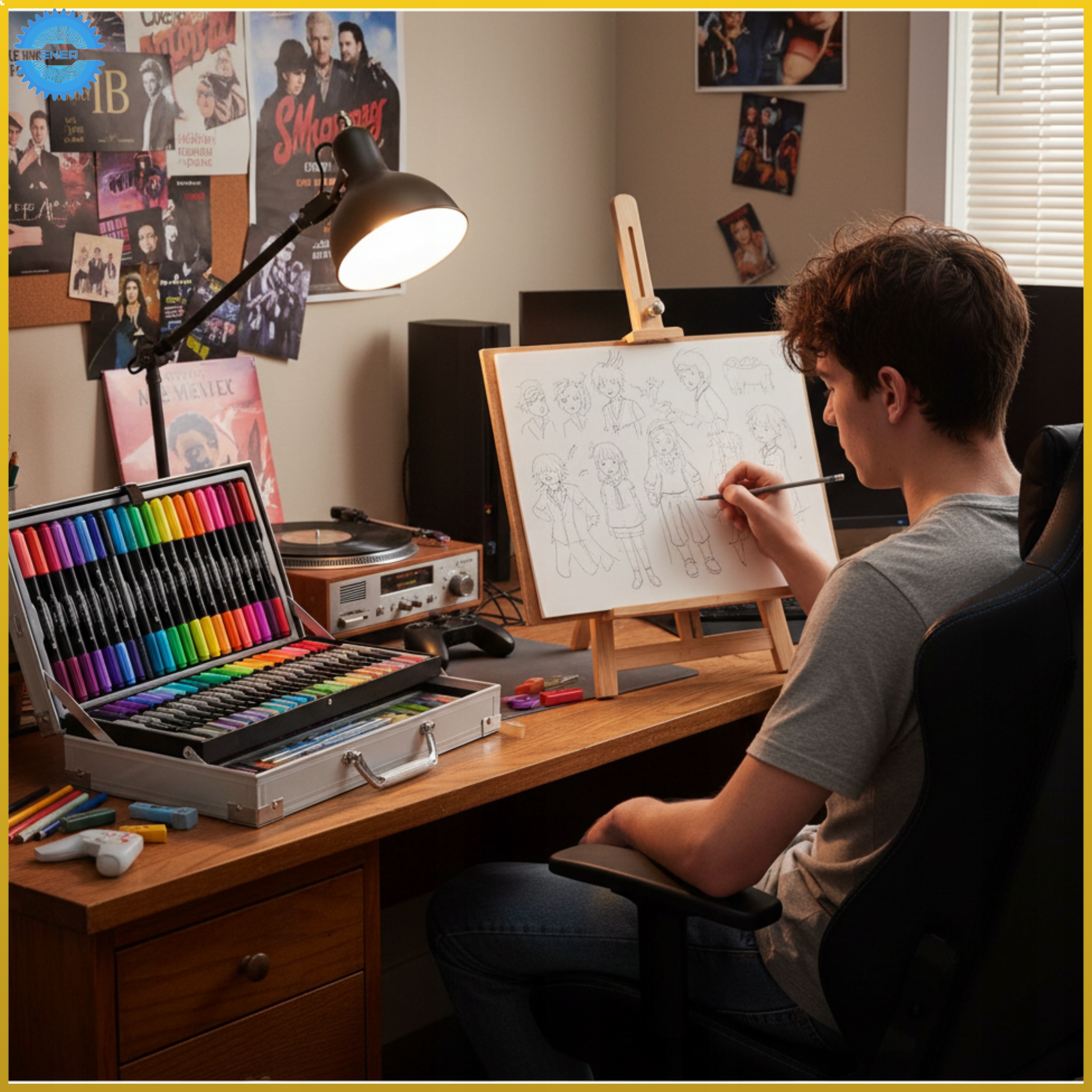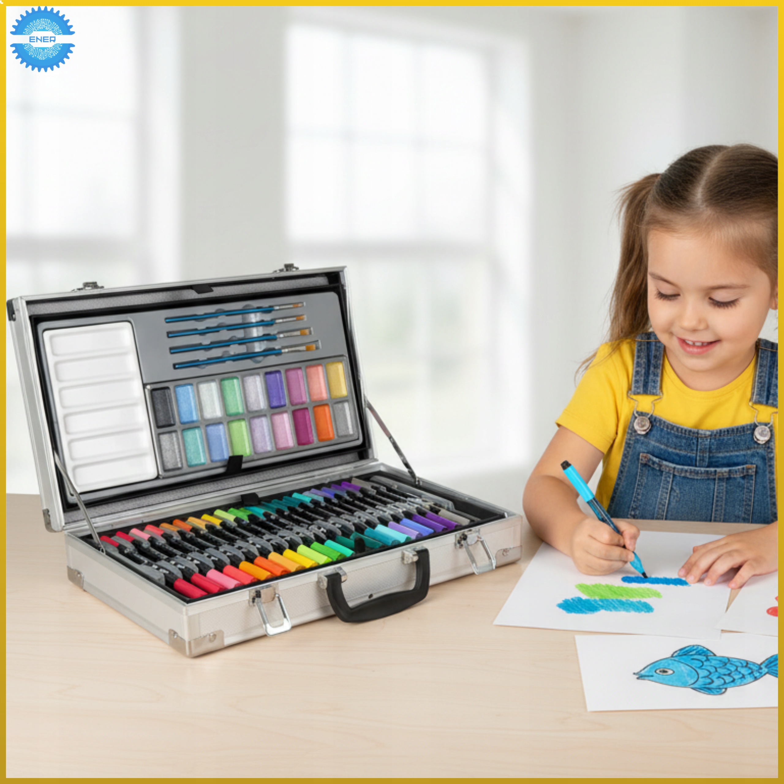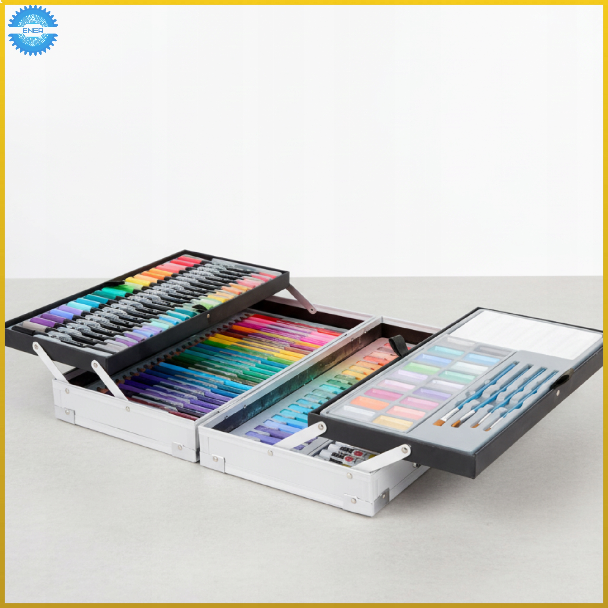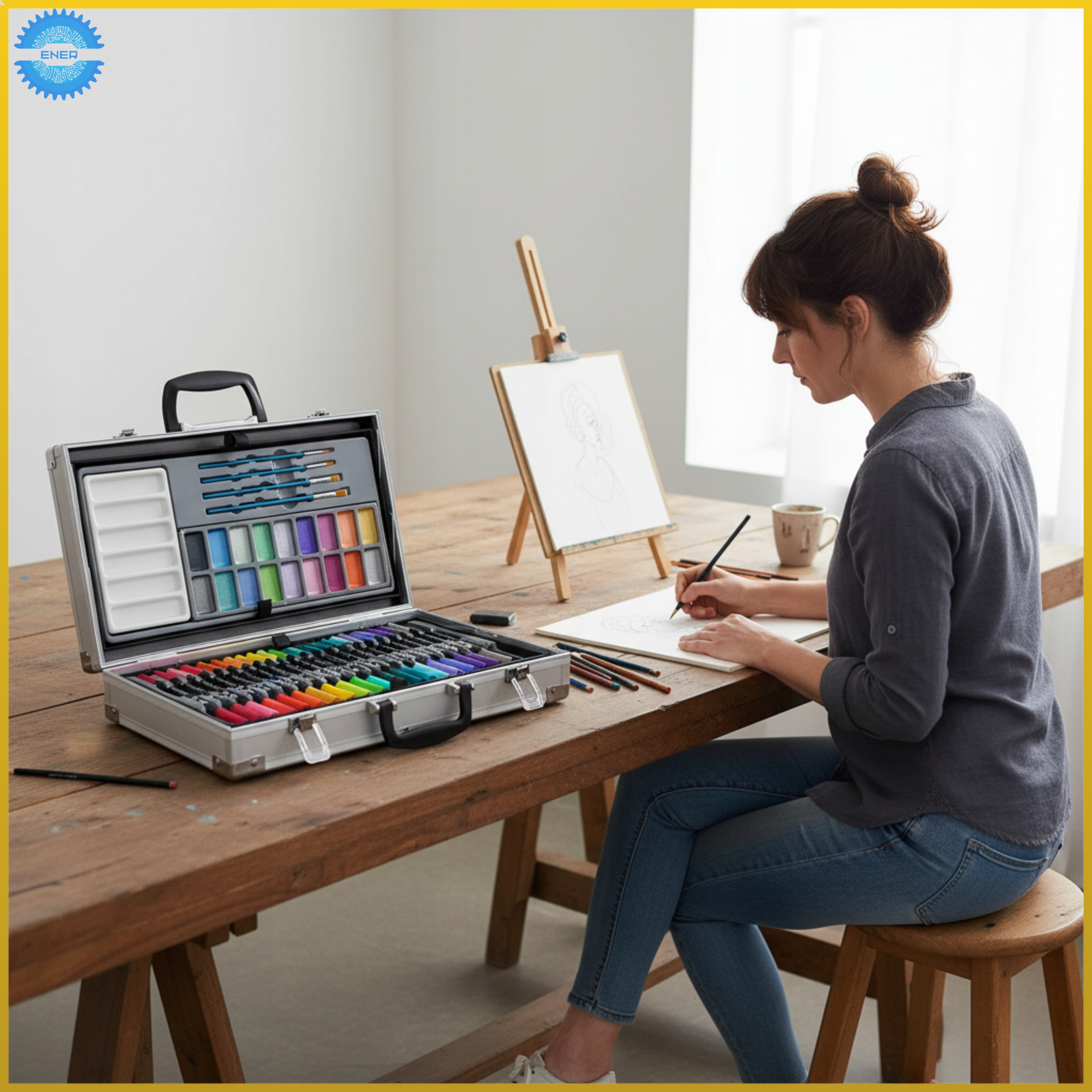 Раскройте свой творческий потенциал с помощью профессионального алюминиевого чемодана для рисования и рисования, который идеально подходит как детям, так и взрослым. В набор входят двойные маркеры, мелки, акриловые краски, акварельные пастели и палитра для смешивания красок, что позволяет создавать проекты во многих техниках.