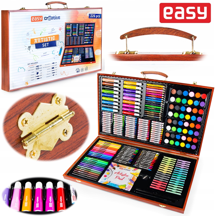 Художественный набор-отличное начало приключений молодого художника. Набор функционален и состоит из 226 практических элементов. Множество аксессуаров сделает все использование художественного набора, чтобы стать отличным путешествием в мир искусства. В комплект включает 48 акварельных красок, 4 палитры, 17 мини -карандашей, 18 мини -маркеры, 55 масляных пастелей, 32 мела, 24 подсвечника, 24 ручки из войлока, 1 темпе подошва, 1 HB -карандаш, 1 кисть, 1 ноутбук. Посылка, изготовленная из материалов высочайшего качества, имеет широкий спектр цветов, что еще больше облегчит производительность художественных произведений или повседневного использования. Целое было размещено в элегантном и практическом чемодане, облегчая передачу и дополнительно завоевание эстетической ценности всего набора. Набор для рисования и рисования является не только обязательным элементом оборудования каждого студента или любовника творческих задач, но и отличная идея подарка.