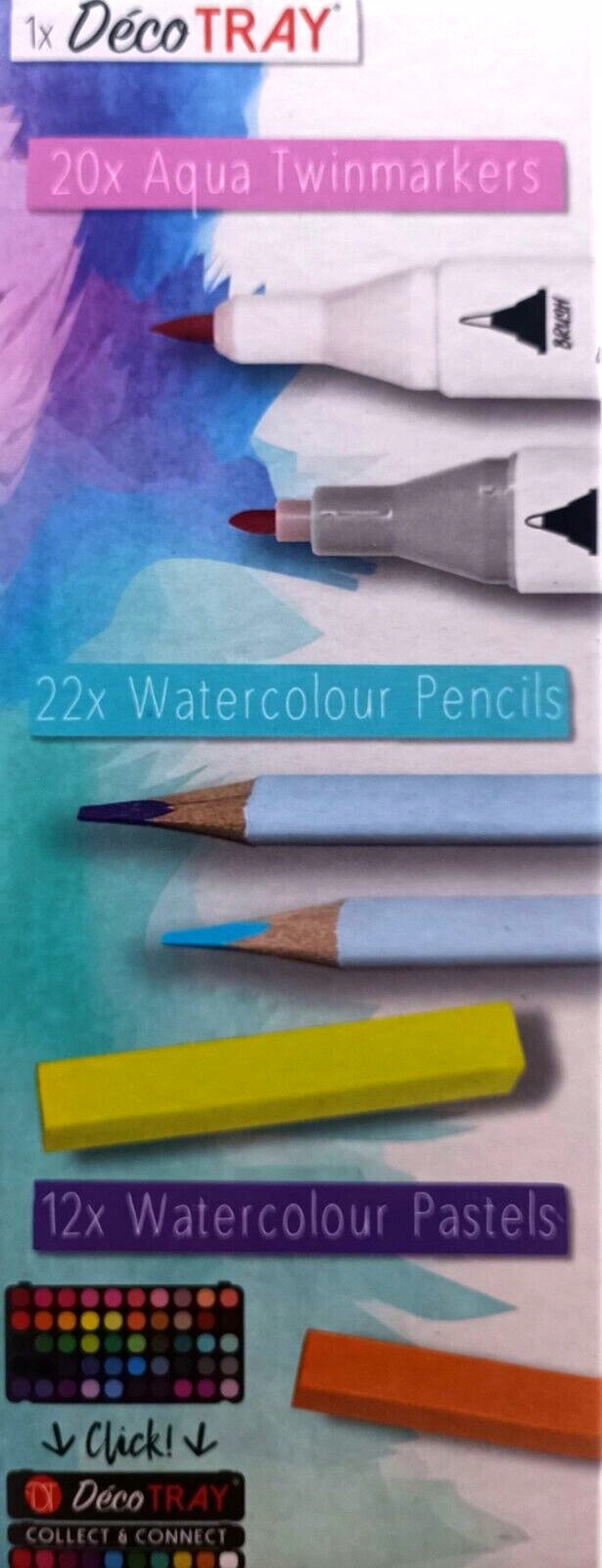 - Включает акварельные маркеры, акварельные мелки и акварельные пастели.