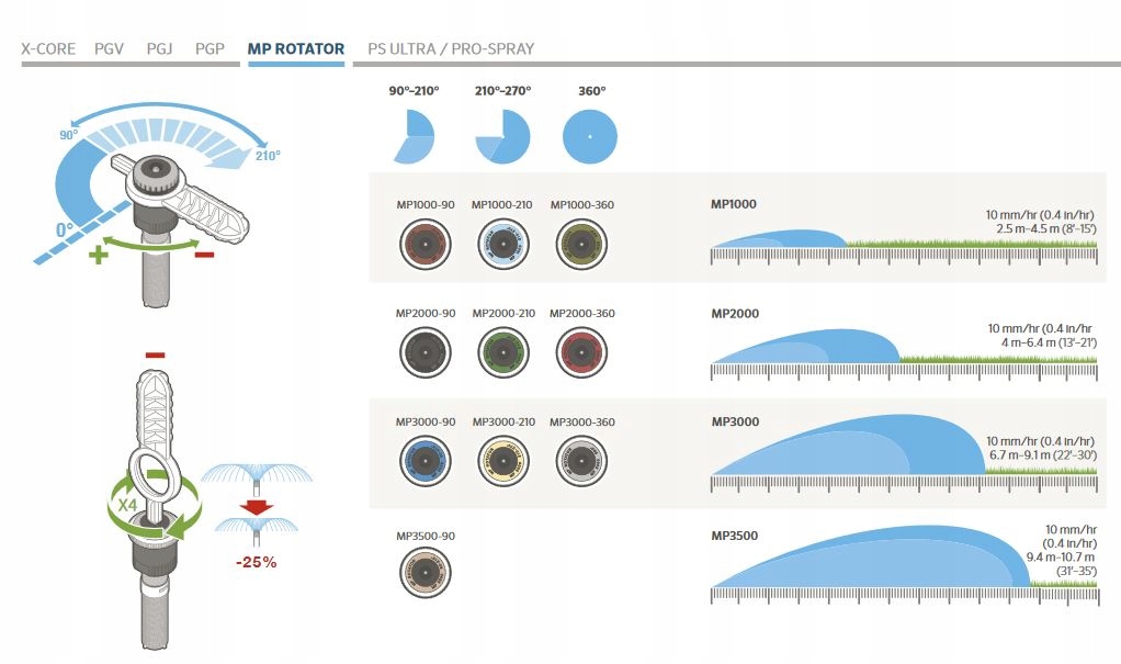 MP Rotator имеет функцию, позволяющую контролировать количество воды, протекающей через насадку, в зависимости от настроек угла и радиуса. Каждый поток достигает определенной области, что обеспечивает более высокую эффективность и равномерный полив территории.