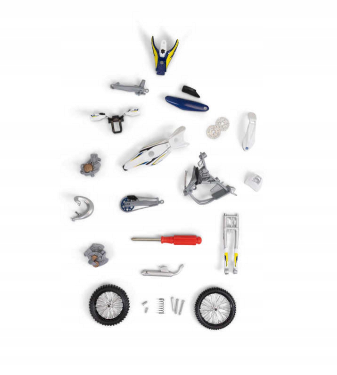 Мотоциклы имеют подвижные элементы, окрашенные металлические и пластиковые конструкционные элементы, резиновые колеса и подвеска. После складывания мы получаем полностью функциональный, приводящий автомобиль, идеально подходящий в качестве игрушки для ребенка или модели для коллекционера.