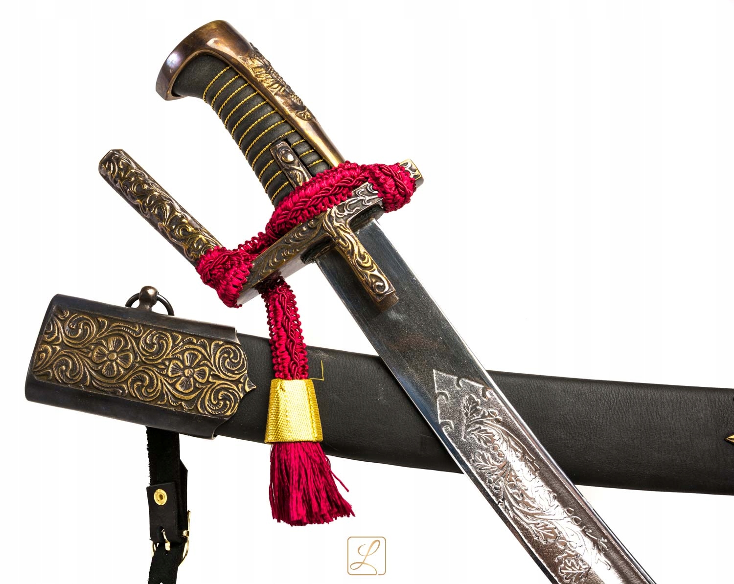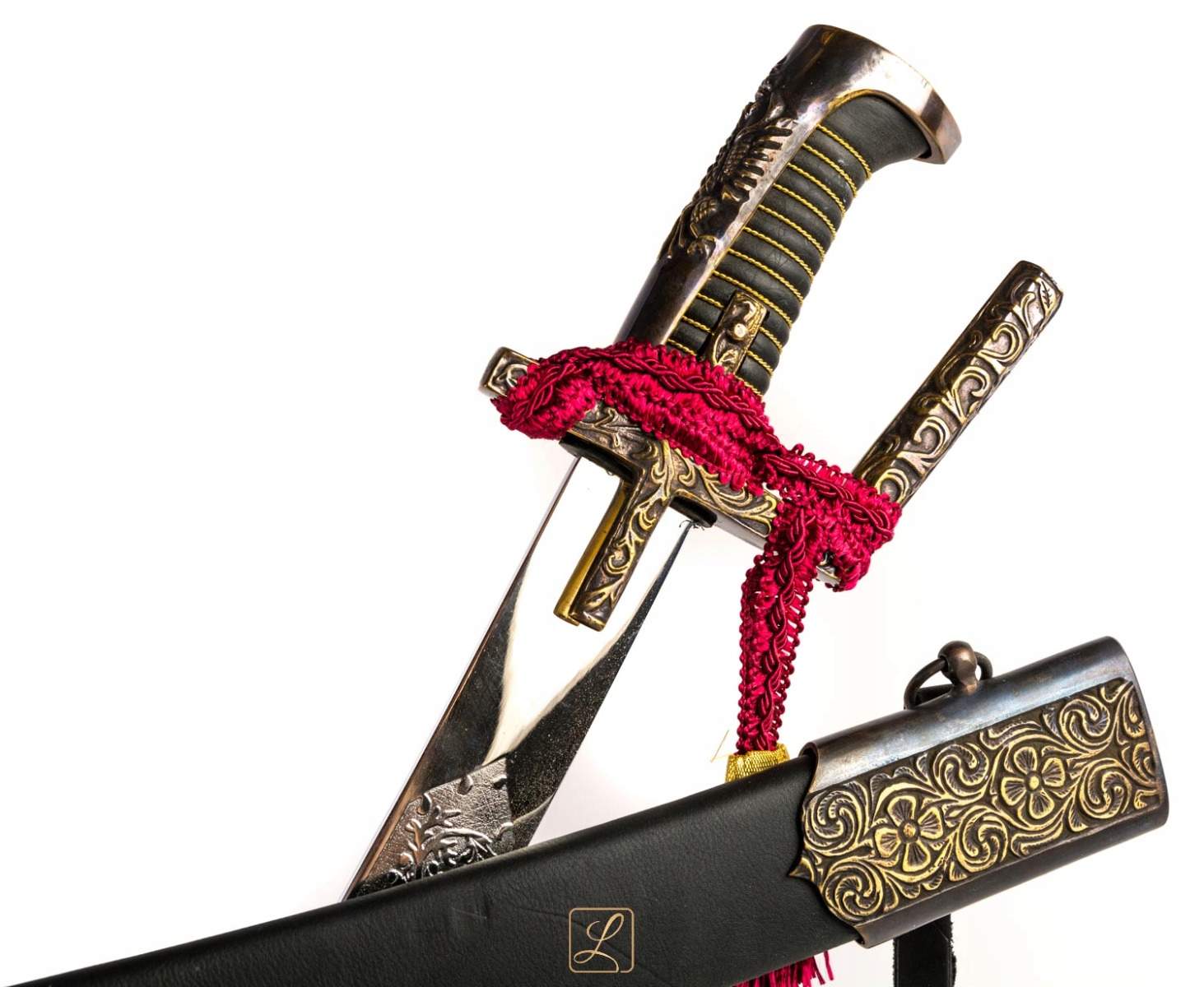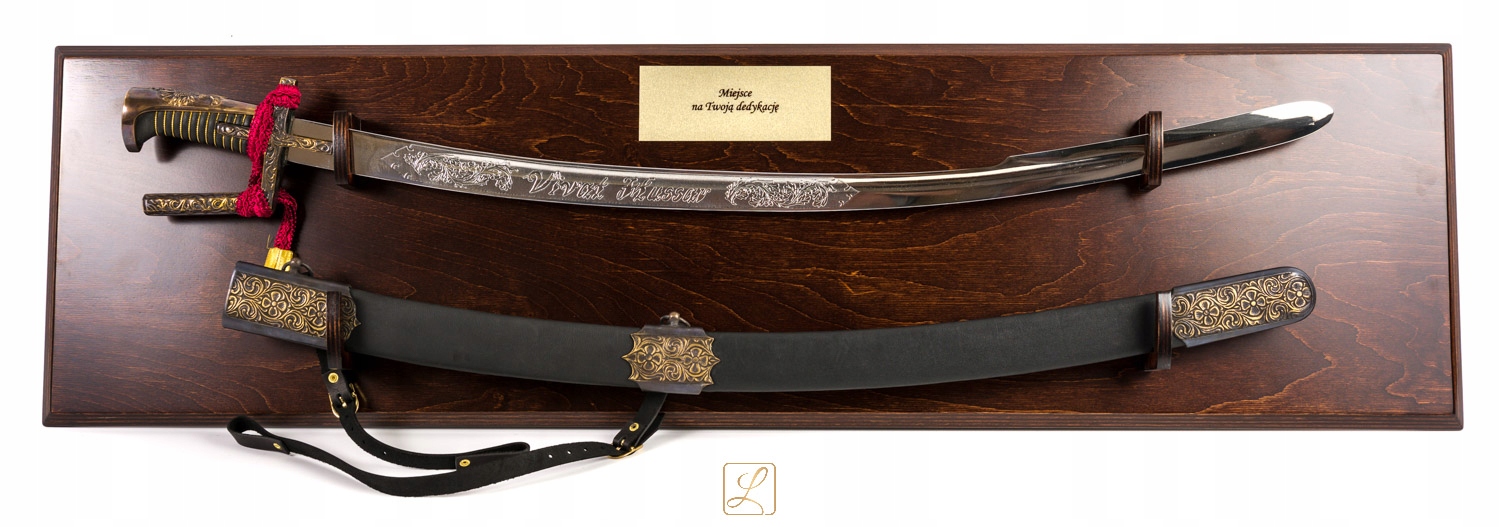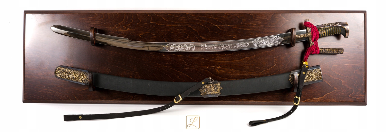 Ранний тип гусарной сабле. Таким образом, это сочетание лучших особенностей венгерской, турецкой и западной европейской саблей. Адаптированный для верховой езды, используемый в основном в Гусаре, его также называли Гусарс Палаш или Крей (наклон). Кордлас. Ручка привязывания латуни, снаружи изображения орла в короне. Мост, перекрестный кластер с усами, украшенный украшениями. Лук открыт, не связан с головой, оставляя ручку под углом. Латунные элементы, покрытые патиной, утверждаются в разоблаченных местах. Высококачественное стальное лезвие не закаленное, хром. Субтитры на голове: "vivat hussar" и "deus spes mea" . Декоративная стропа, привязанная к ручке из материальной ленты, закончилась бордовым краном. Клинок не требует какого -либо обслуживания, хромированный слой идеально защищает сабле от ржавчины. Влагалище сделано из дерева, покрытой натуральной кожей, украшенной латунными крышками. Красиво сделанная сабля, она выглядит эффективной на прикрепленной таблице. Таблица из фанеры, окрашенная и лакированная для коврика. В задней части стола два крючка, чтобы повесить на стену. Работа польского мастера для презентации белого оружия. Фитинги на влагалище и ручка из полированной латуни.