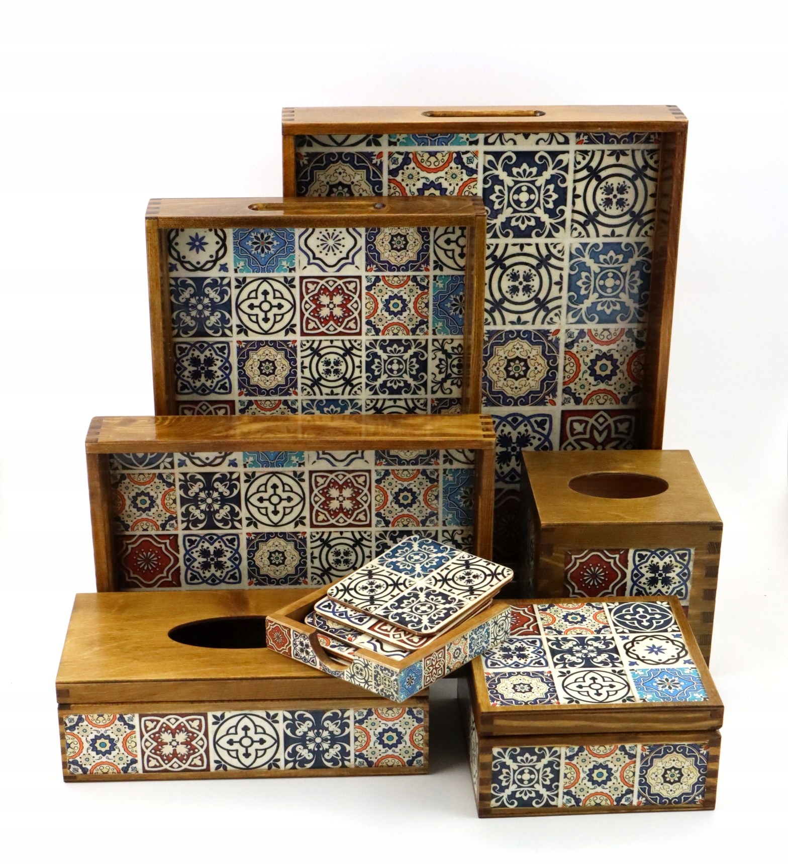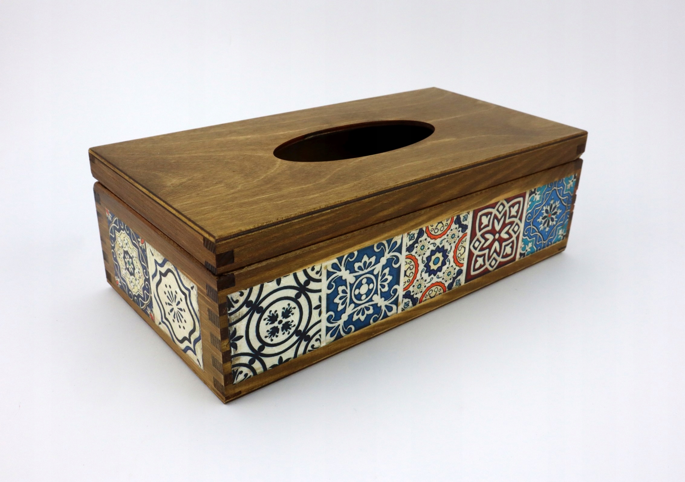 Носовой платок прямоугольной формы, деревянный, расписанный вручную, открывается сверху. Декорирован в технике декупаж рисовой бумагой с мотивом азулежу.
