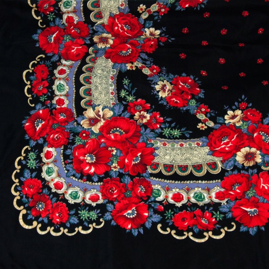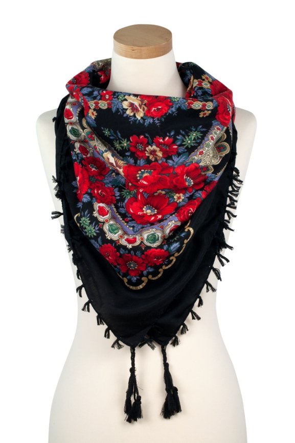 Народный платок с выразительным цветочным орнаментом, отделанный бахромой.