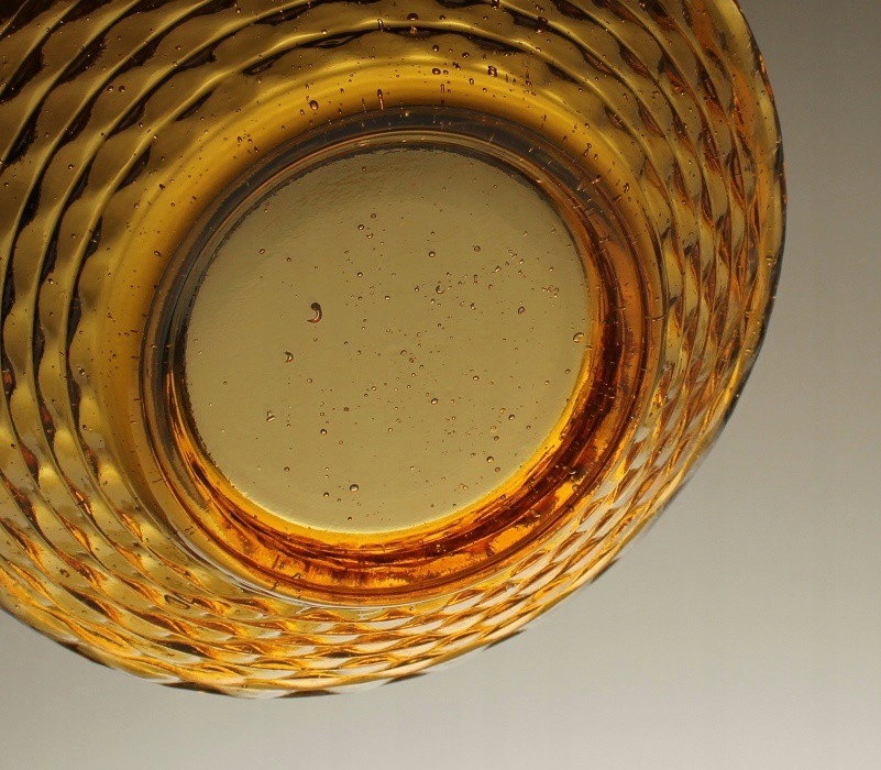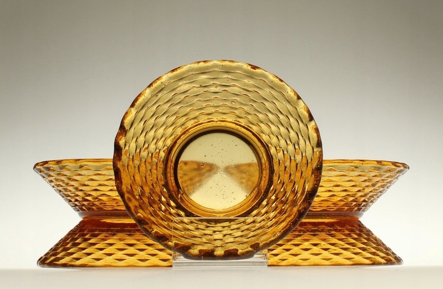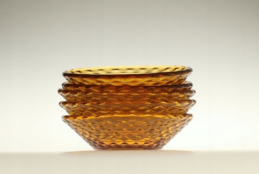 Пять салатников из прессованного стекла. Янтарный, с множеством крошечных пузырьков воздуха, внедренных в стеклянную массу. Они произведены на стекольном заводе «Прондничанка» в Кракове.