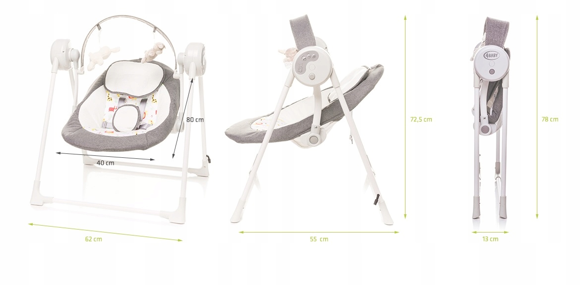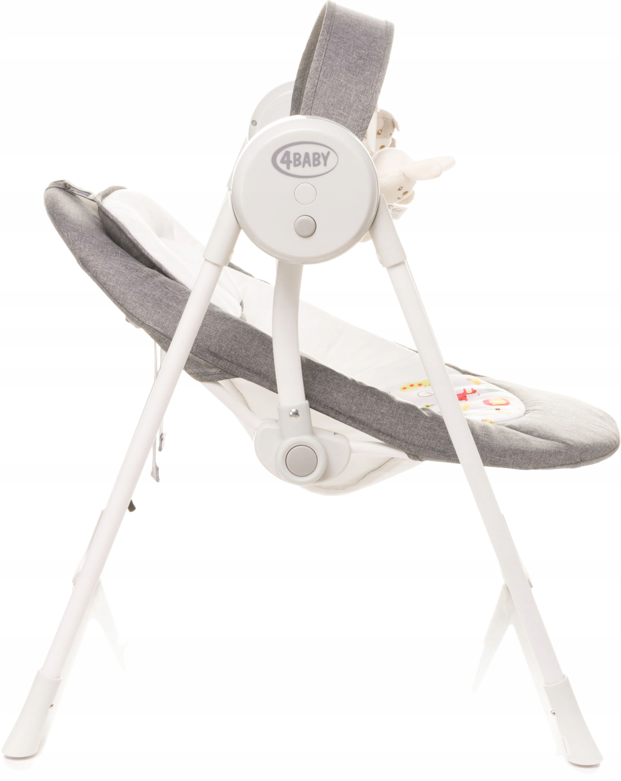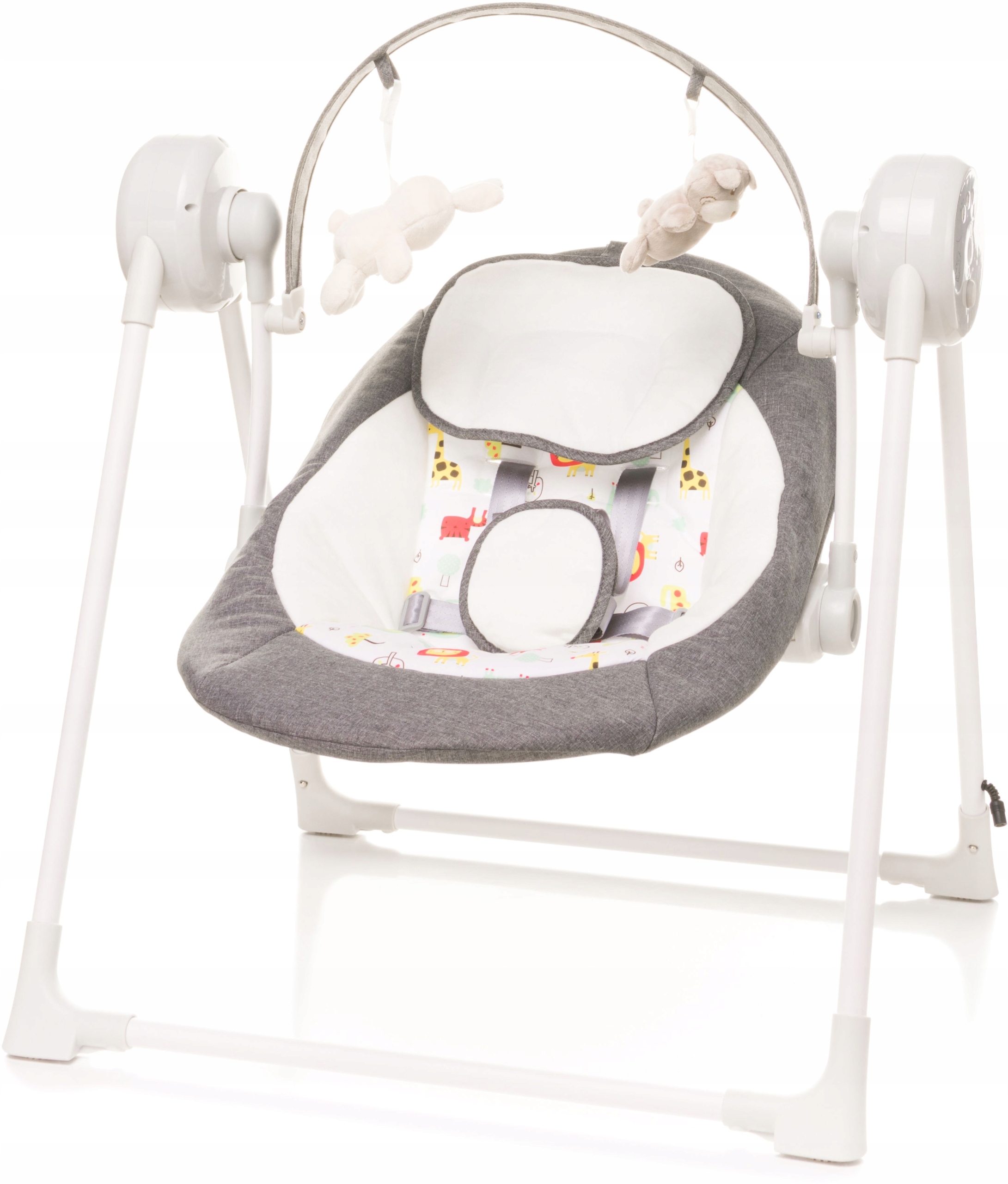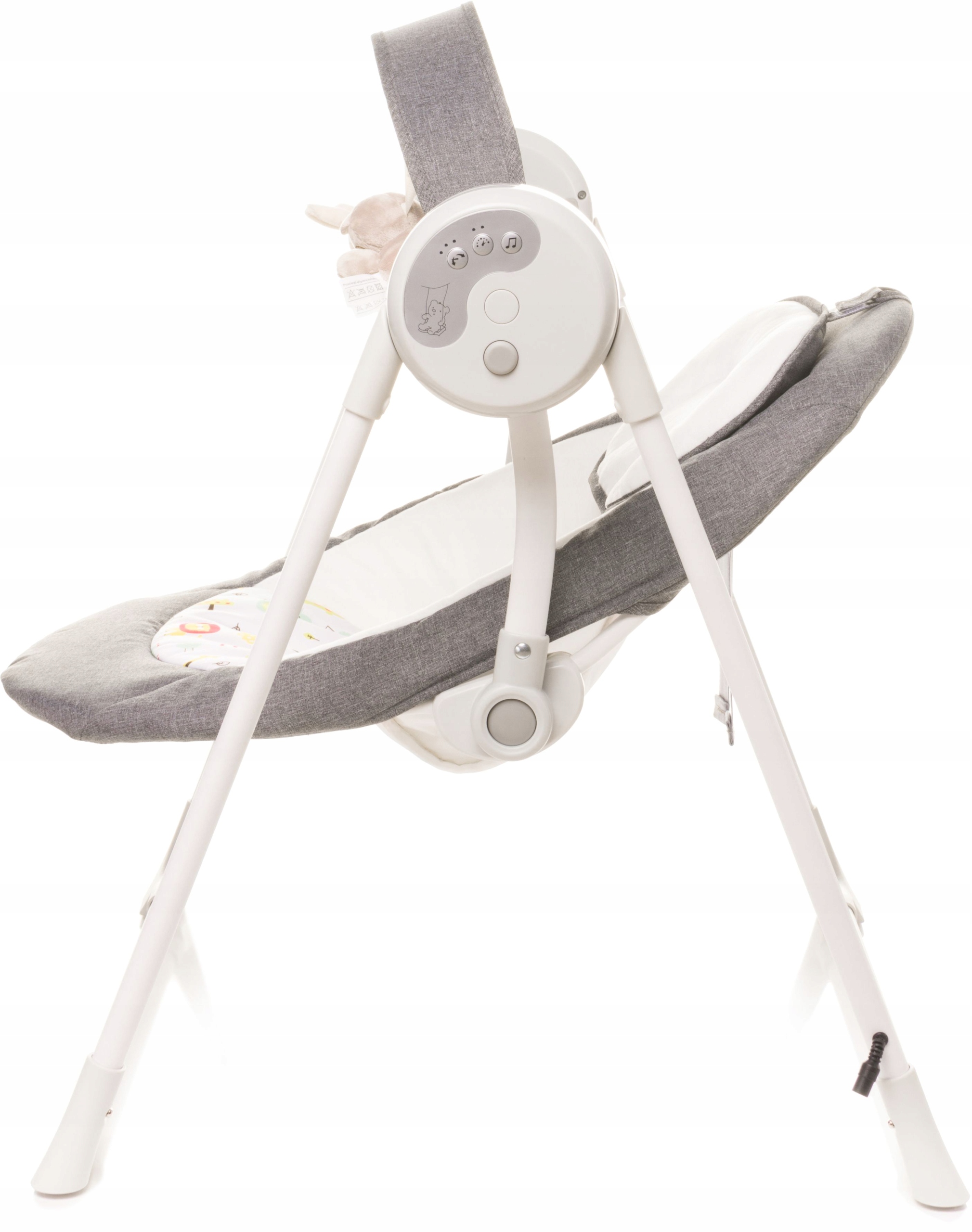 Swing — электронные качели, которые стимулируют развитие ребенка и позволяют родителям минутку отдохнуть. Он имеет 5 скоростей качания с тихим раскачиванием, 12 встроенных мелодий с регулируемой громкостью и таймер до 30 минут. В комплект входит кабель питания USB, также возможно использование качалки с аккумулятором.