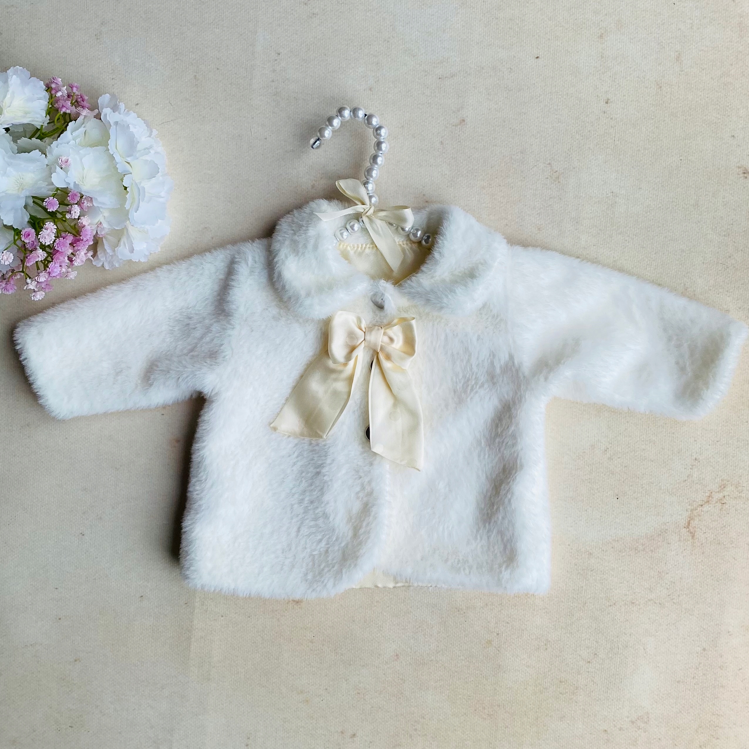 Крестильный мех для девочки выполнен из красивого, очень мягкого на ощупь меха Ала-Альпака, с более длинным ворсом на поверхности. Крестильная шуба для девочки – это чрезвычайно приятное, теплое, мясистое и в то же время очень легкое покрывало. Утепленный меховой вариант имеет подкладку из стеганого утеплителя. Шуба для девочки на крещение на шее имеет полукруглый воротник, застегивается на три кнопки и декорируется элегантным бантом ванильного цвета.