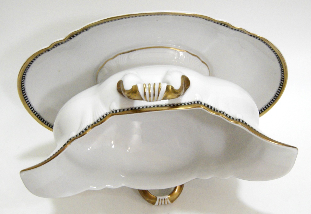 Предмет аукциона — красивый старинный соусник, изготовленный из белого фарфора, украшенный позолотой. Фарфор отличного качества и бренда.