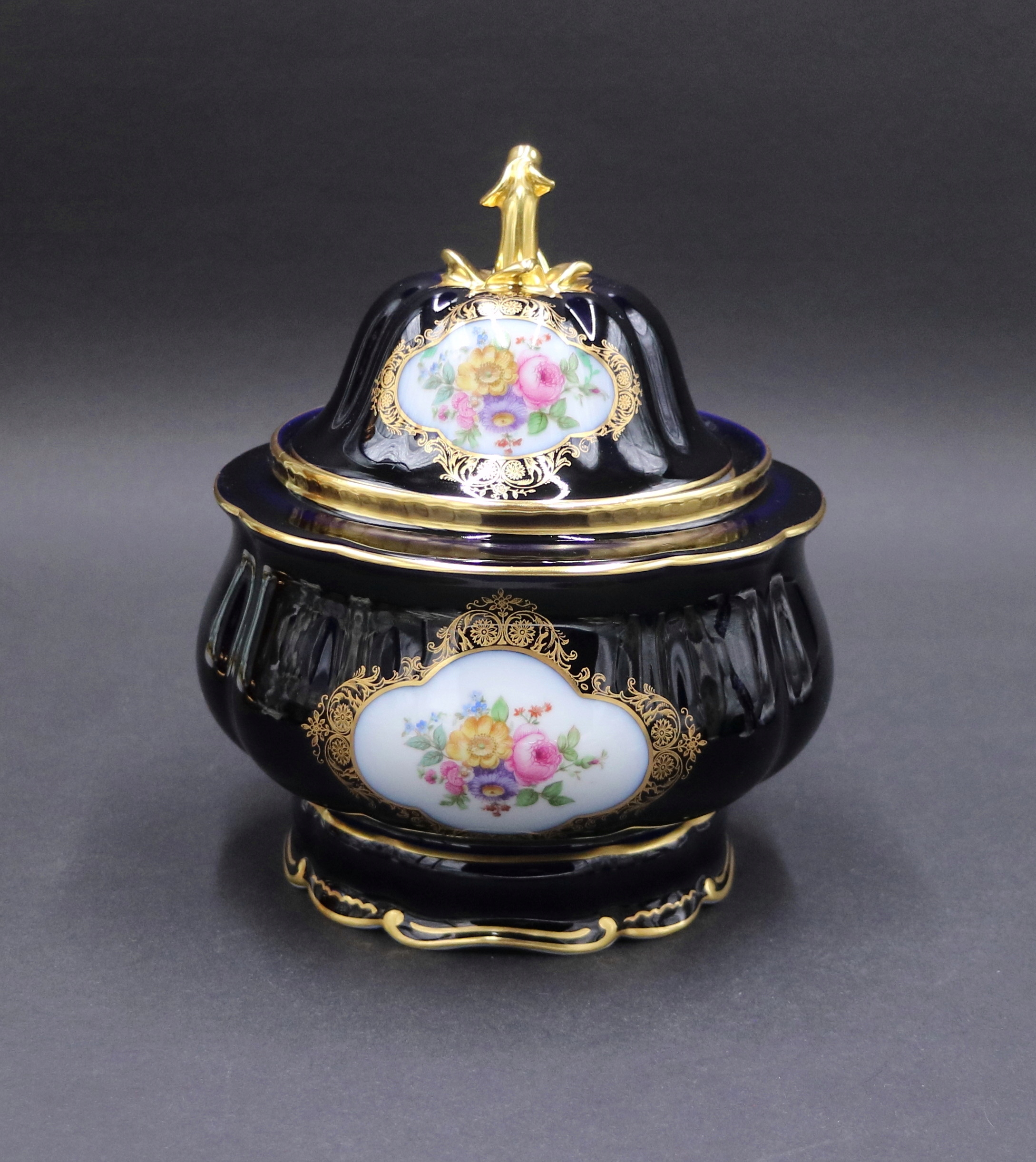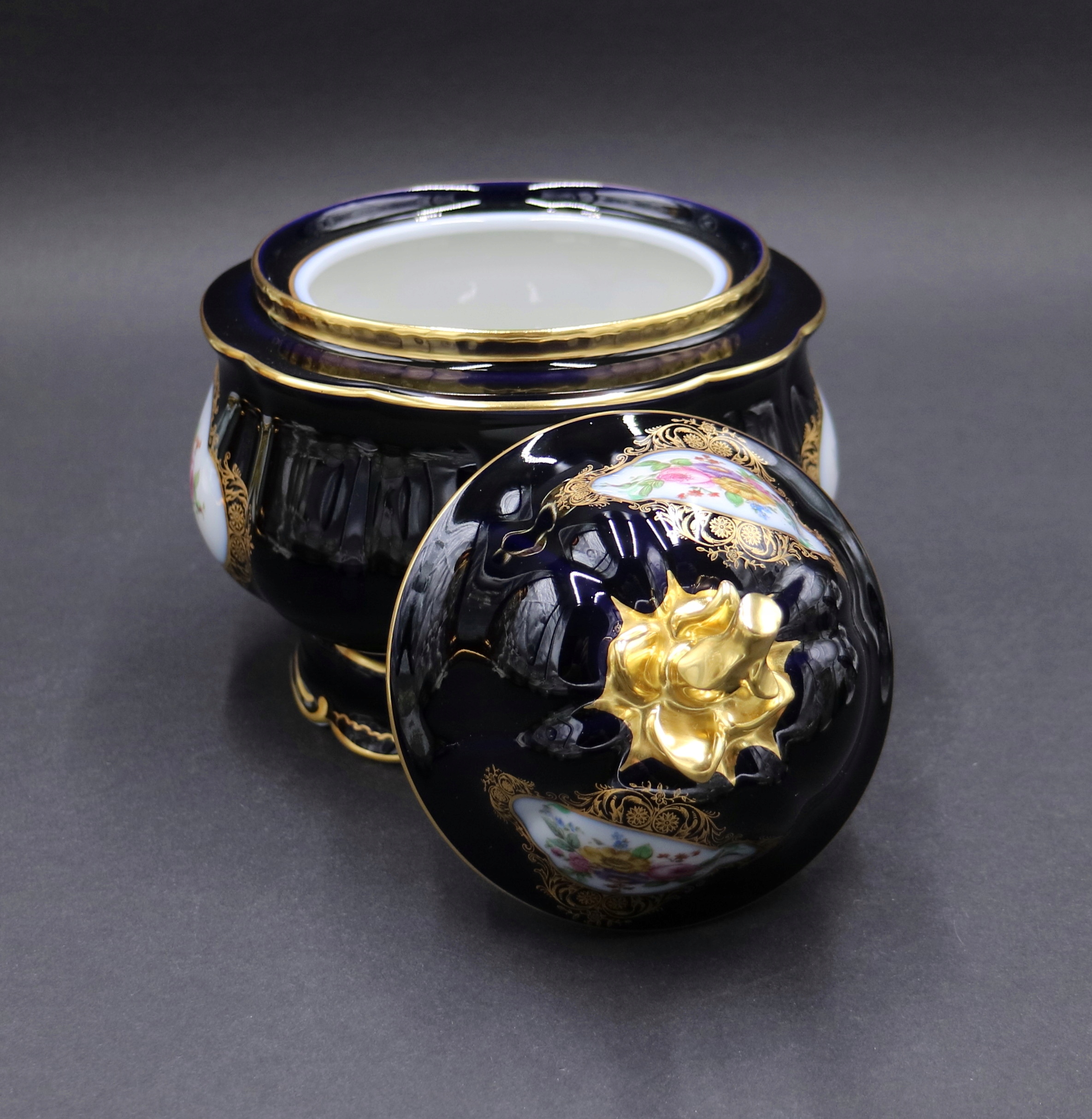 Белый фарфор, украшенный кобальтом, позолотой и букетом ярких цветов.