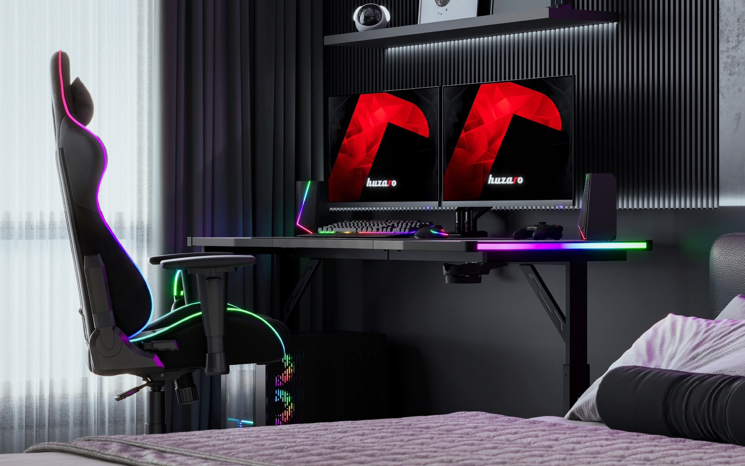 ⭐ Huzaro Hero 4.8 RGB (черный) — стильный игровой стол с эффективной RGB-подсветкой, большой столешницей (160 × 60 см), подставкой XXL, отверстиями для кабелей и регулируемыми ножками — все создано для комфортной и эстетичной работы или игрового процесса.