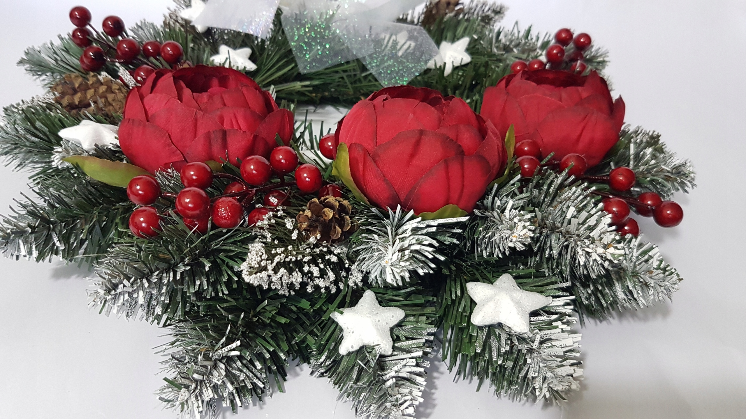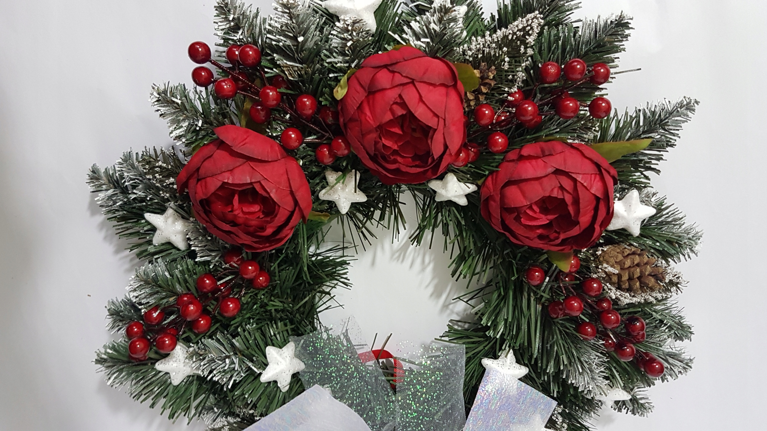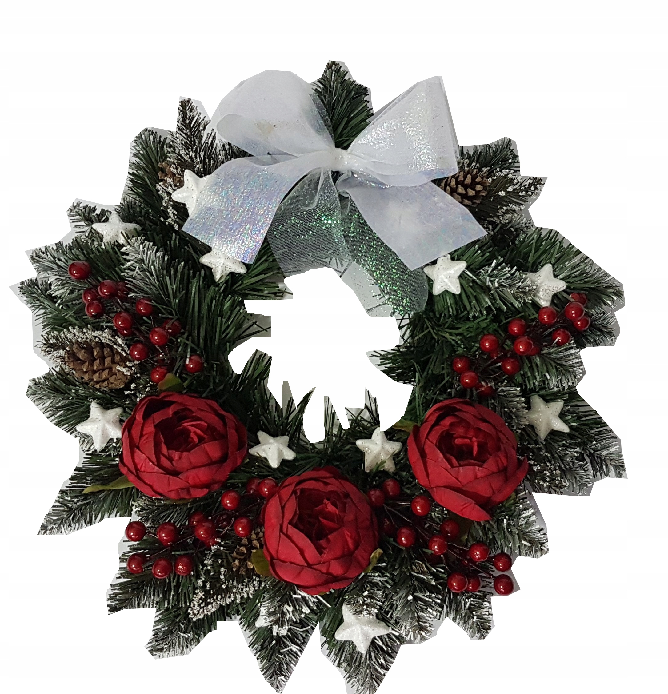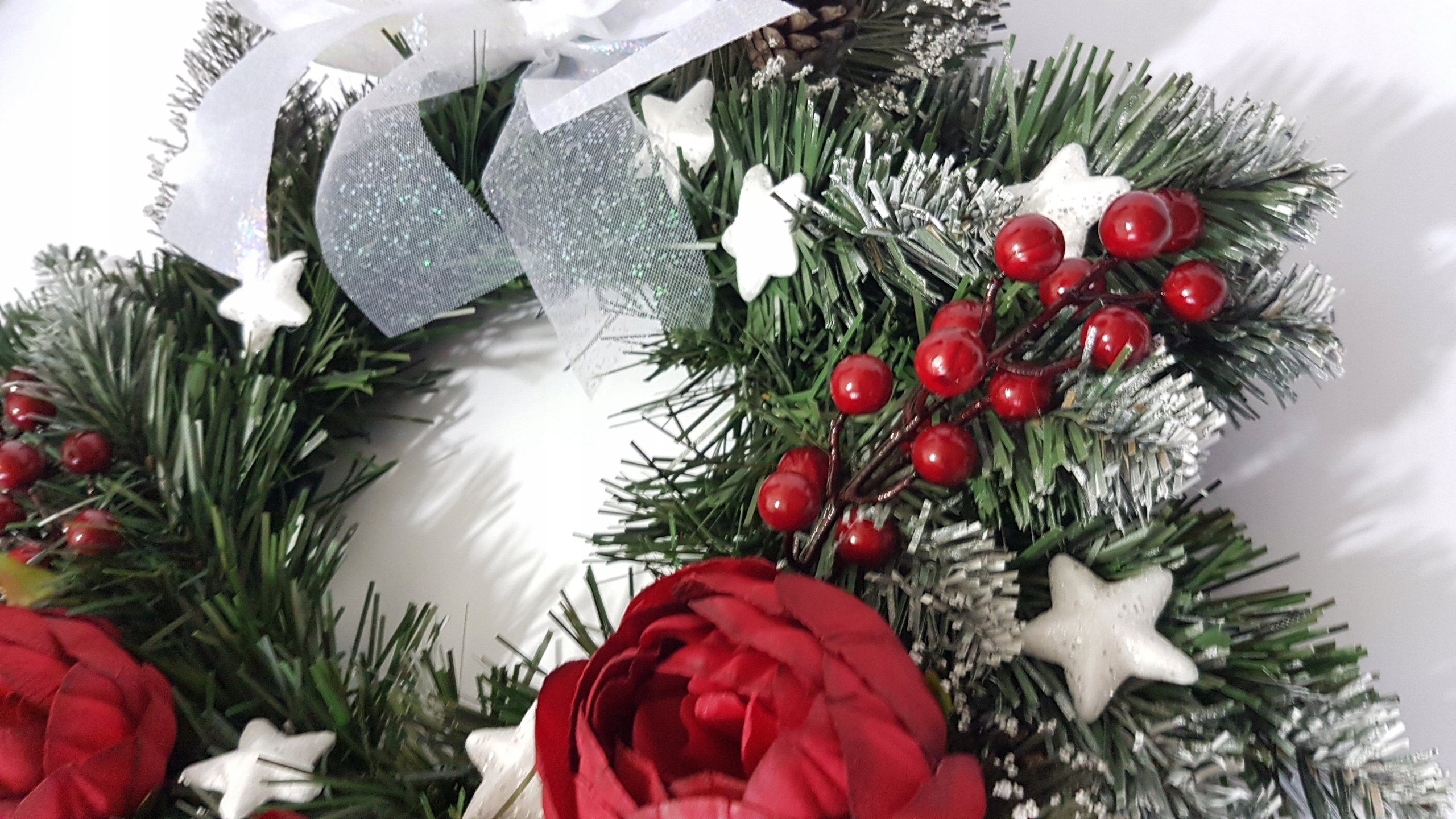 Предмет продажи — искусственный хвойный венок, украшенный бордовыми цветами, красными шарами, блестящими белыми звездами и декоративным блестящим бантом.