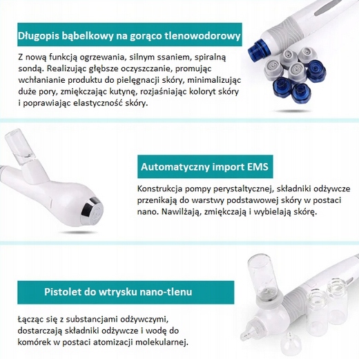 - Технология: Кислородно-водородная очистка горячими пузырьками, RF, EMS, Микроток, Инжекция кислорода, Холодный и горячий молот.