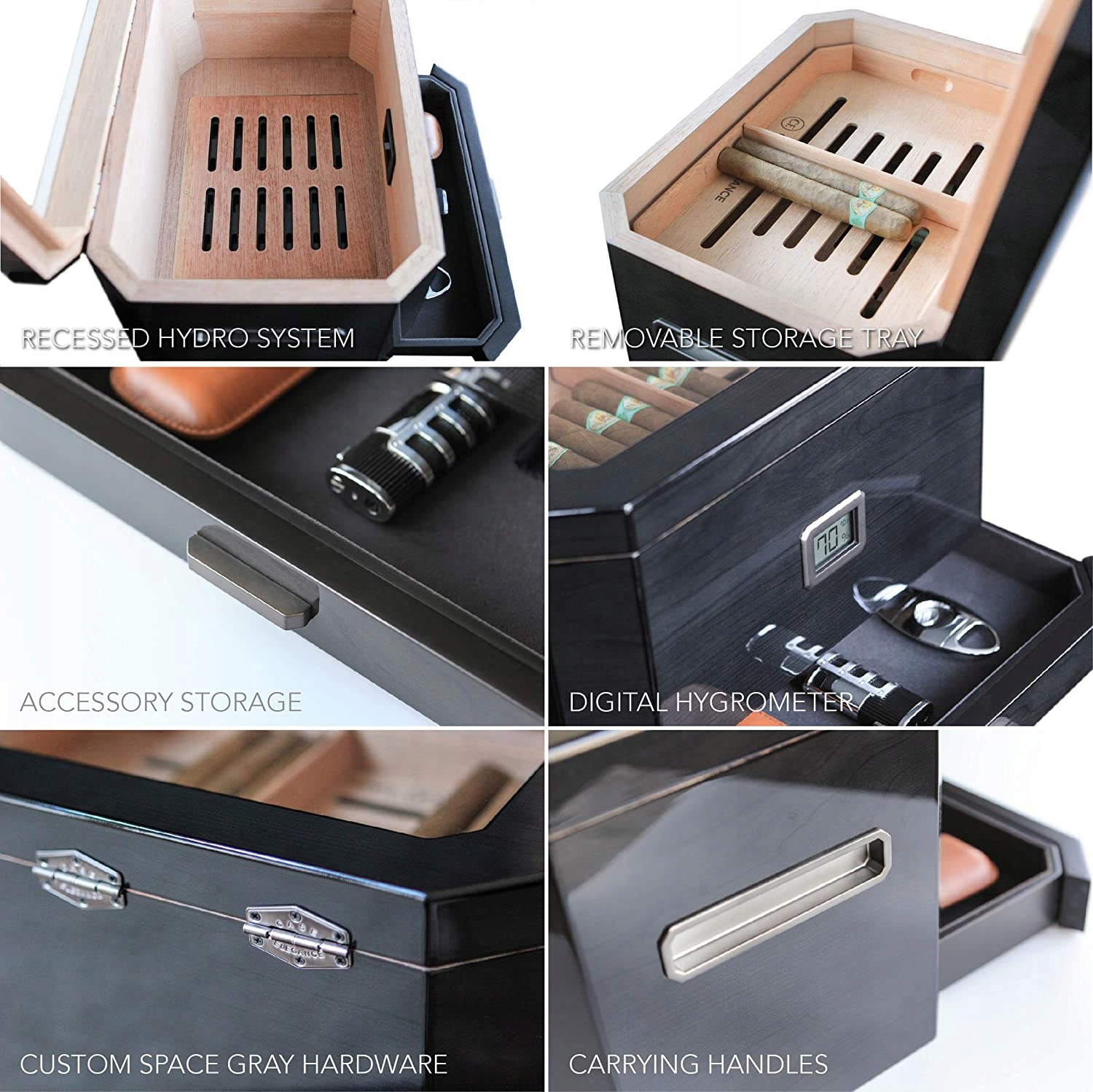 ★ БОЛЬШОЙ ОКТОДОР ► Это наш самый большой хьюмидор, вмещающий до 100 сигар (в зависимости от типа сигар). Мы сохранили все желательные особенности хьюмидора Case Elegance, такие как передний цифровой гигрометр, магнитная крышка и ящик для аксессуаров. Octodor имеет тщательно продуманную восьмиугольную форму и имеет элегантную глянцевую черную отделку. ★ ВСТРАИВАЕМАЯ СИСТЕМА УВЛАЖНЕНИЯ ► Octodor поставляется с запатентованной гидросистемой; Точная и простая в обслуживании система увлажнения сигар. В отличие от других моделей, мы специально построили этот хьюмидор так, чтобы система была встроена в систему, чтобы она не занимала места и позволяла хранить больше дыма. Гидросистема поддерживает ваш хьюмидор CE в идеальном состоянии при относительной влажности от 65% до 70%. Мы рекомендуем приобрести решение для хьюмидора CE для лучшего вкуса и долговечности. ★ ЦИФРОВОЙ ГИГРОМЕТР ► Основой хьюмидоров CE является встроенный цифровой гигрометр. Это наиболее точный способ контролировать и гарантировать, что ваш хьюмидор правильно выдержан. Металлическая крышка цвета «серый космос» была специально отформована с учетом восьмиугольной формы хьюмидора. ★ ХРАНЕНИЕ АКСЕССУАРОВ ► Храните зажигалку, нож для резки сигар и дорожный футляр в большом выдвижном нижнем ящике для аксессуаров. Ящик облицован плюшевым фетром и оснащен специальной восьмиугольной ручкой для удобного доступа к аксессуарам. (Аксессуары CE в комплект не входят) ★ СЪЕМНЫЙ ПОДДОН ИЗ КЕДРА ► Съемный поднос из кедра с подвижной перегородкой разделяет сигары, обеспечивая лучший поток воздуха и приправ. Поднос также помогает организовать курение. ★ СТЕКЛЯННЫЙ ВЕРХНИЙ ДИСПЛЕЙ ► Крышка восьмиугольной формы оснащена большим окном из закаленного стекла, позволяющим продемонстрировать вашу коллекцию прекрасных сигар. ★ Одержимость деталями ► Мы приложили все усилия, чтобы представить вам этот великолепный хьюмидор. От насыщенного черного рояльного цвета до индивидуальной фурнитуры цвета «серый космос».