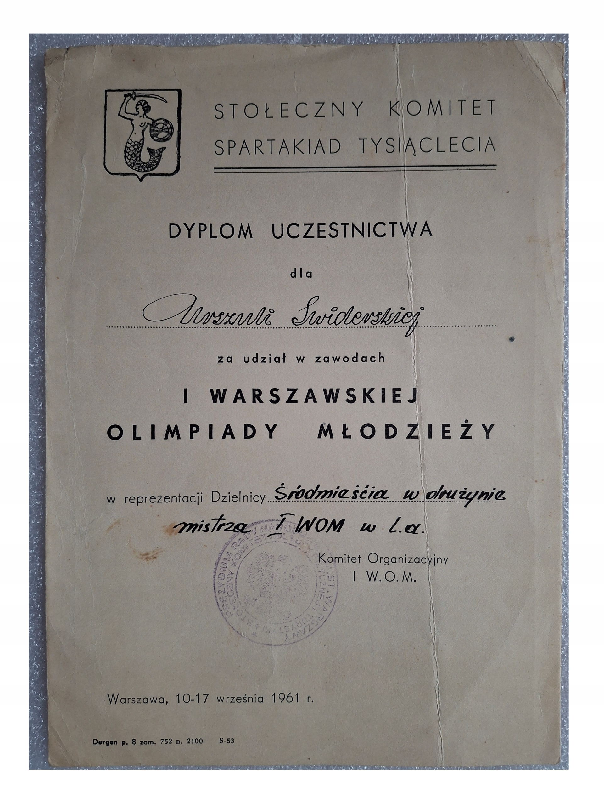 І ВАРШАВСЬКА ЮНАЦЬКА ОЛІМПІАДА 1961 - ДИПЛОМ