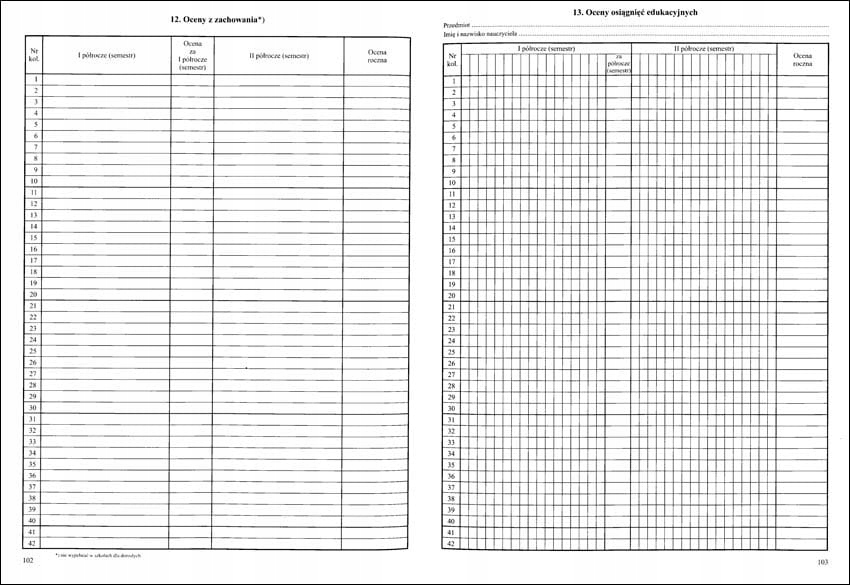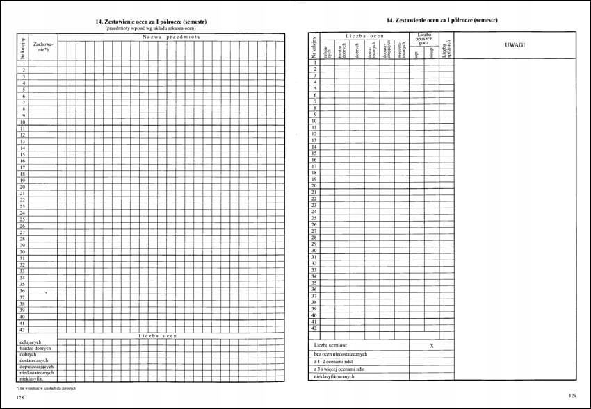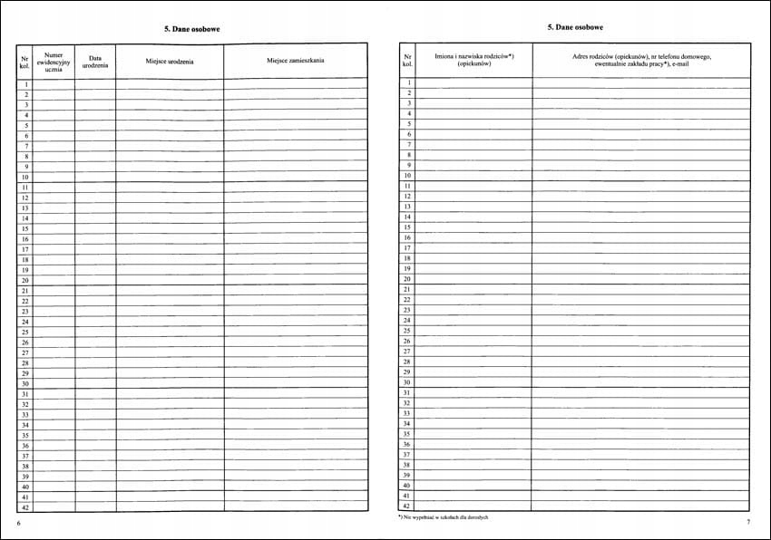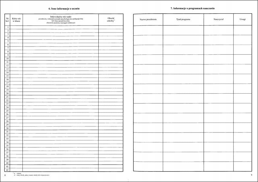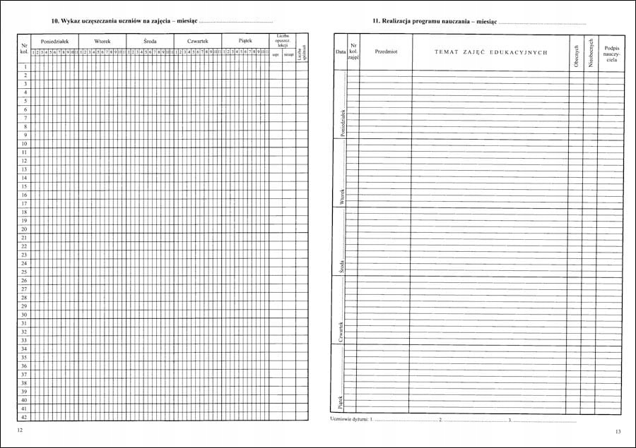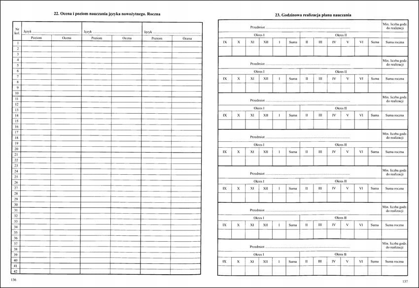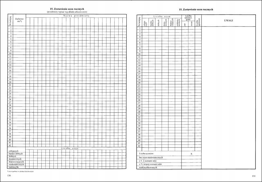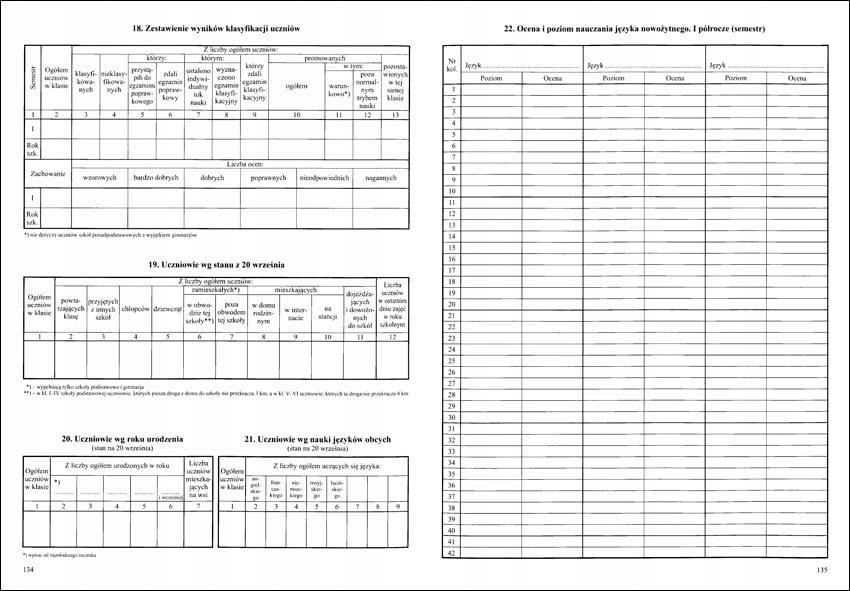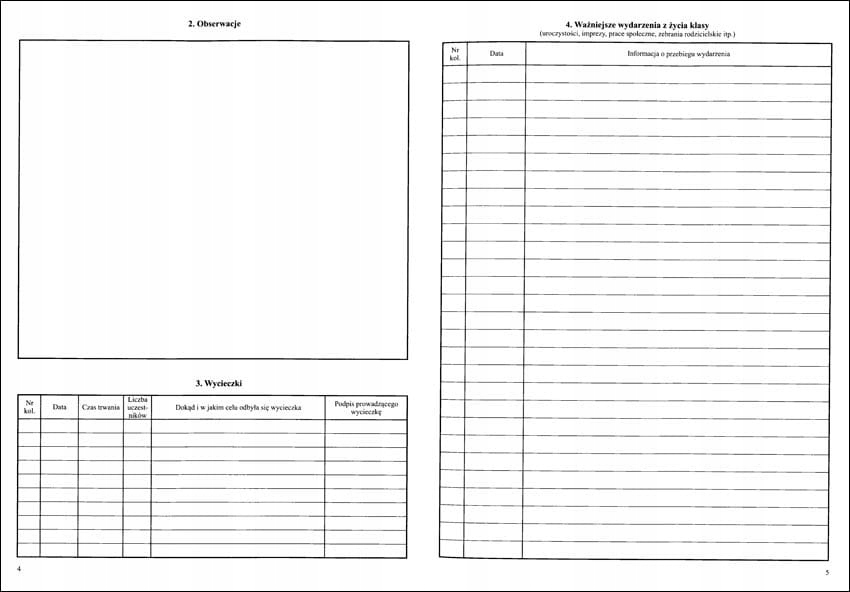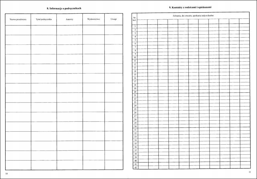 <р>1. Еженедельный учебный график. <р>2. Наблюдения. <р>3. Поездки. <р>4. Важные события из жизни класса. <р>5. Персональные данные. / PESEL *заполняется по желанию / <р>6. Другая информация о студенте. <р>7. Информация об учебных программах. <р>8. О руководствах. <р>9. Контакты с родителями и опекунами. <р>10. Список студентов, посещающих занятия. <р>11. Реализация учебной программы. <р>12. Ставьте оценки. <р>13. Оценка образовательных достижений. <р>14. Сводка оценок за первое полугодие (семестр). <р>15. Краткое изложение годовых оценок. <р>16. Результаты теста и пробного экзамена. <р>17. Результаты зачета и экзамена районной экзаменационной комиссии. <р>18. Сводка результатов классификации учащихся. <р>19. Студенты по состоянию на 20 сентября. <р>20. Студенты по годам рождения. <р>21. Студенты по данным изучения иностранного языка. <р>22. Оценка и уровень преподавания современного языка. 1-е полугодие (семестр). <р>22. Оценка и уровень преподавания современного языка. Ежегодно. <р>23. Почасовое выполнение учебного плана. <р>24. Сводка (посещаемость учащихся занятий и учебных дней). <р>25. Список посещающих за ... полугодие (семестр). <р>26. Список посещающих за ... полугодие (семестр). <р>27. Информация о поведении учащихся (достижения, похвалы, комментарии). <р>28. Проверяем учебник.Примечания (6 страниц)