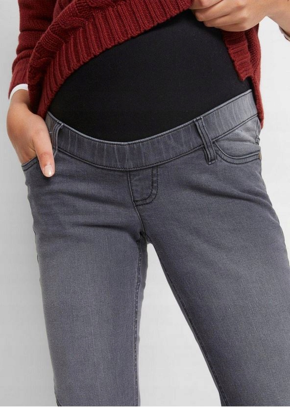 брюки для беременных из коллекции Bon Prix в Grey -, как на изображениях под описанием, с карманами и с поясом беременности. Сшивая на ногах, ноги свернуты на заводе. Удобное разрешение, описанное производителем как Jeggings.