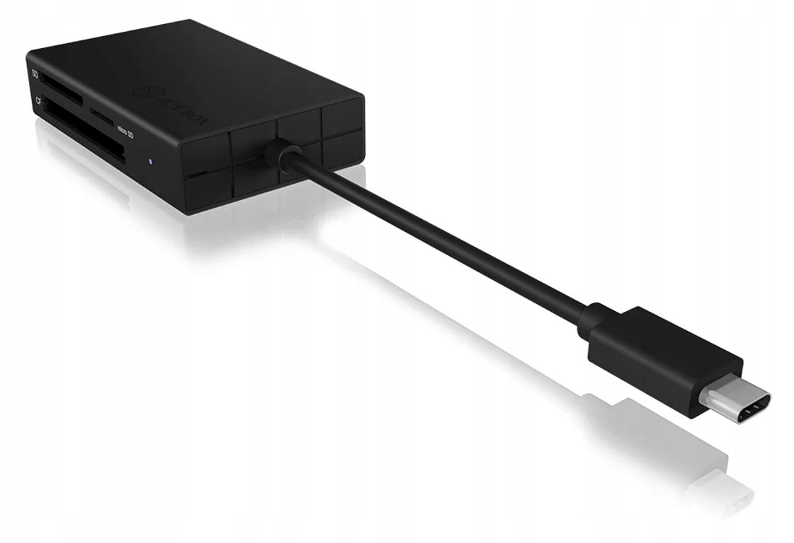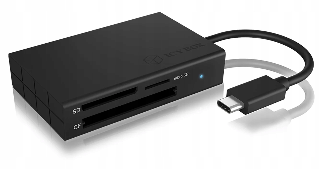 ICY BOX IB-CR401-C3. Поддерживаемые типы карт памяти: CF, MicroSD (TransFlash), MicroSDHC, MicroSDXC, SD, SDHC, SDXC, Цвет товара: Черный, Материал корпуса: Алюминий, Пластик. Тип интерфейса: USB 3.2 Gen 1 (3.1 Gen 1) Type-C. Тип питания: USB. Ширина изделия: 49 мм, Глубина изделия: 77 мм, Высота изделия: 17 мм. Ширина упаковки: 25 мм, Глубина упаковки: 100 мм, Высота упаковки: 203 мм