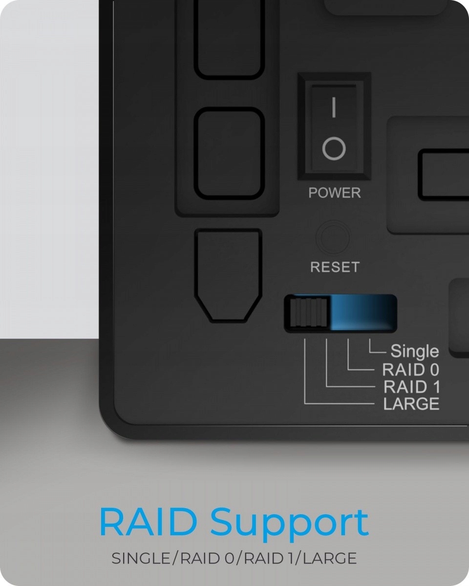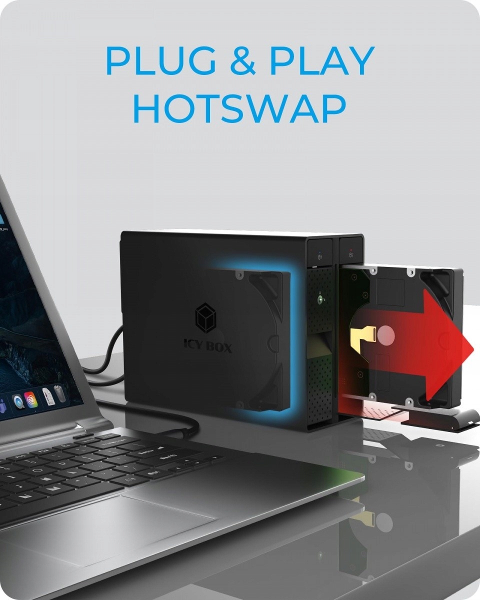 IB-RD3802-C31 RAID-корпус USB Type-C для двух 3,5-дюймовых дисков SATA Особенности: Для 2x 3,5-дюймовых дисков дюймовые диски SATA I, II, III (6 Гбит/с), емкость диска не ограничена. Поддержка RAID 0/1/LARGE/SINGLE, автоматическое восстановление. Светодиодные индикаторы показывают состояние системы и ошибки дисков. Хост-интерфейс USB 3.1 (Gen 2) со скоростью до 10 Гбит/с. EasySwap — замена жесткого диска без инструментов. 60-мм вентилятор для оптимального охлаждения и производительности. Запираемые передние двери Plug & Play и HotSwap