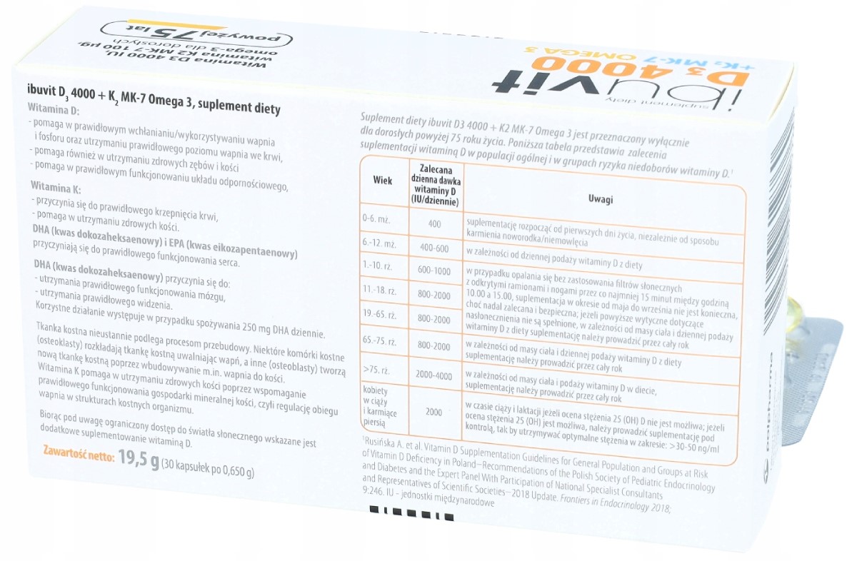 Ибувит Д3 4000 МЕ К2 МК-7 Омега 3 – биологически активная добавка, содержащая высокую дозу витамина D3, витамина К2 и кислот омега-3. Продукт предназначен для взрослых, особенно старше 75 лет.