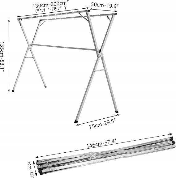 Расширенная конструкция: длина может варьироваться от 51,1 до 78,7 дюйма, размер составляет 51,1 до 78,7 дюйма длиной x 29,5 дюйма x 53,1 высотой (130-200 x 75 x 135 см). Легкое открытие и закрытие с прикрепленными инструкциями, складыванием и сбережением. Он очень устойчив к одеялам, постельных принадлежностям, джинсам, свитерам и вообще не бродит, когда они помещены снаружи, даже при сильных ветрах. Это также решение, которое экономит место, которое идеально расположено в небольшом шкафу и основано на стене, когда оно не используется в вашей компактной прачечной/кладовой. Максимальная нагрузка составляет 143 фунта/65 кг, она оснащена зажимами для носков и ветрозащитных крючков, практичных и практичных. В идеале подходит для разделения различных вещей и поддержания всего чистота и порядка