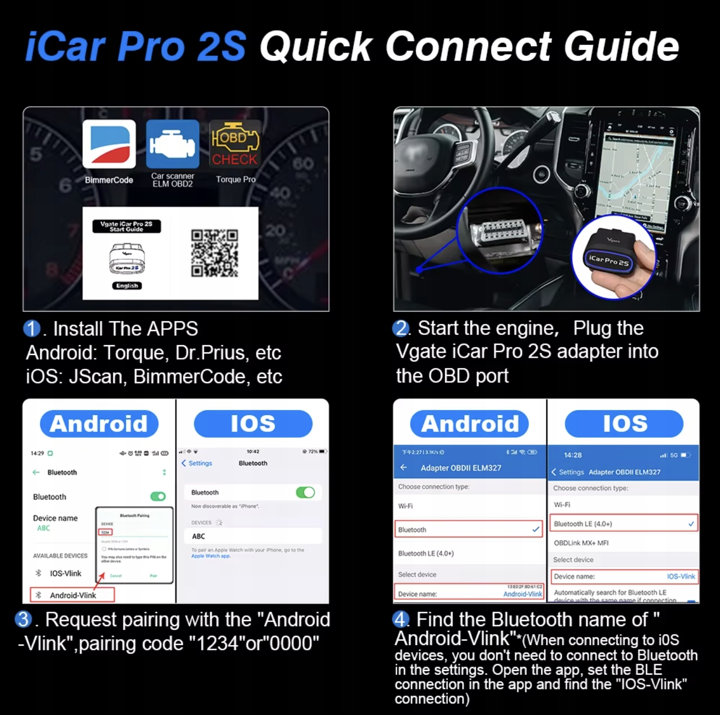 iCar Pro 2S — это продукт Bluetooth, который превратит ваш i Phone, устройство Android или ПК с ОС Windows в профессиональный диагностический сканер. Bluetooth-адаптер OBD-II iCar Pro 2S может получить доступ ко всем легальным протоколам OBD-II. Подключитесь к диагностическому разъему автомобиля через вилку, установите клиентское программное обеспечение и диагностическое программное обеспечение для диагностики неисправностей автомобиля. Например, считывание неспецифичных и специфичных для производителя кодов неисправностей, считывание данных датчиков ЭБУ в режиме реального времени (обороты двигателя, состояние топливной системы, давление топлива, напряжение датчика кислорода и многие другие читаемые параметры автомобиля) и многое другое!