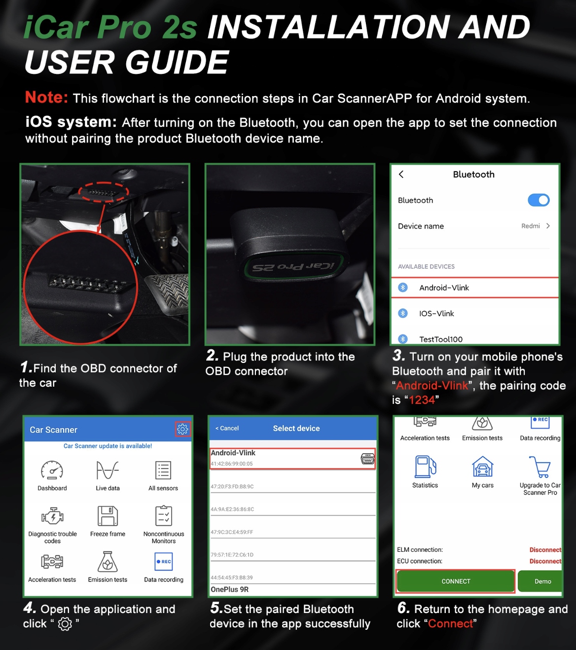 Шаги подключения iCar Pro 2S (на примере приложения Car Scanner)