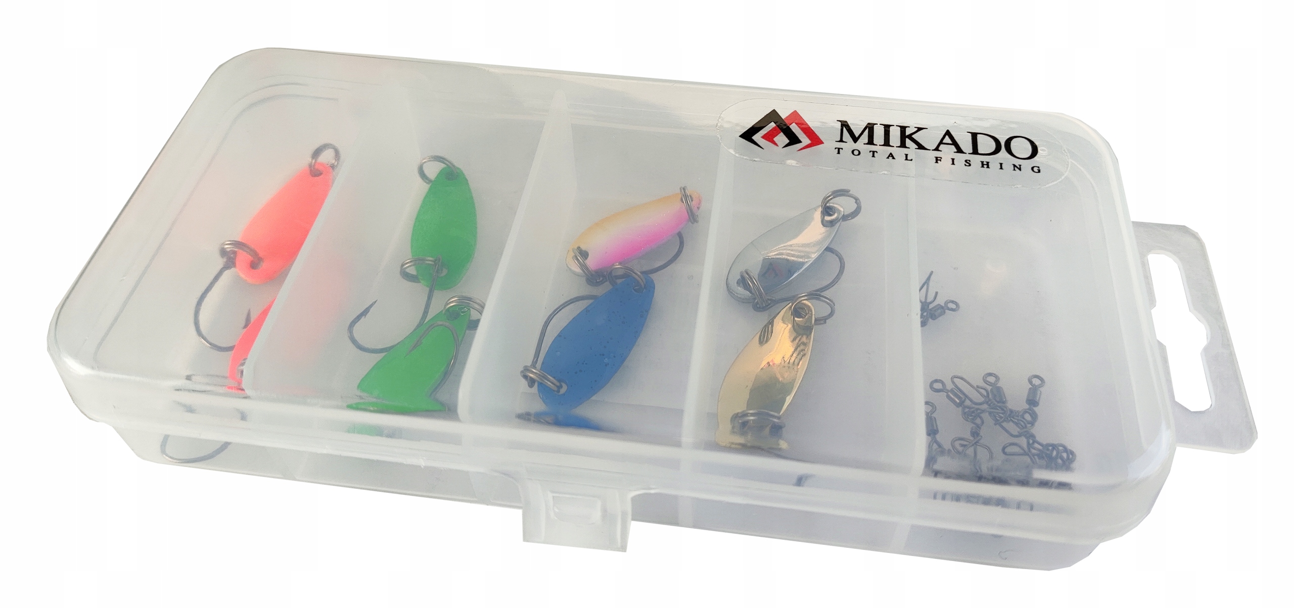 Набор качественных блесен MIKADO для зимней рыбалки блесны заключены в компактную коробку с быстросменными английскими булавками.