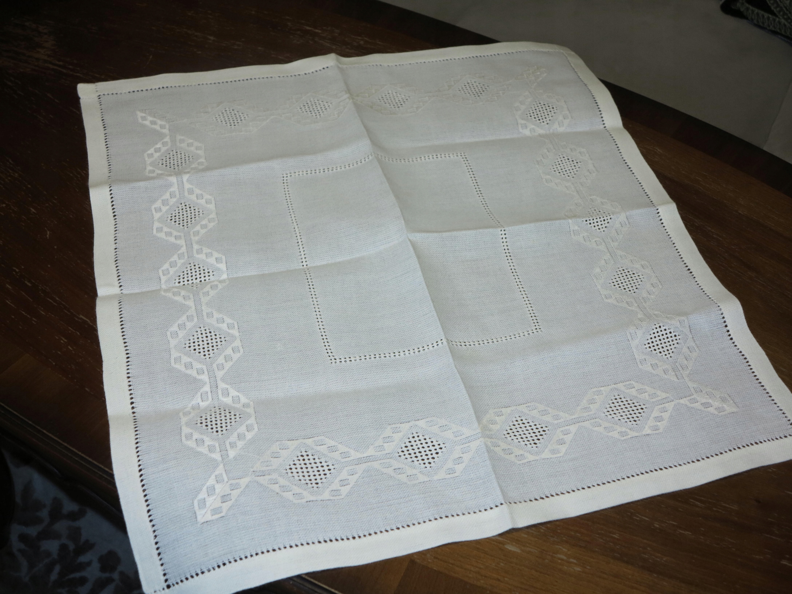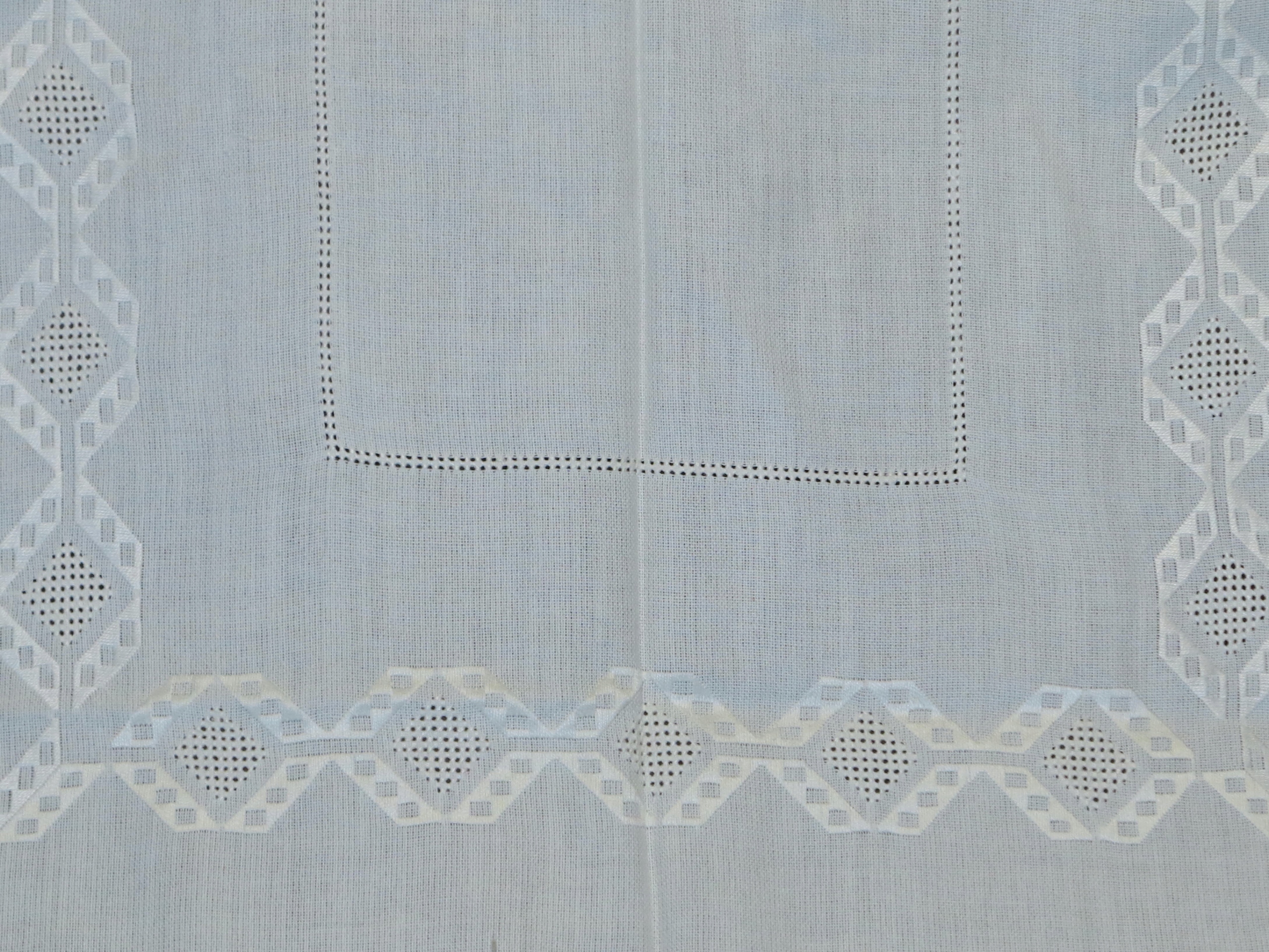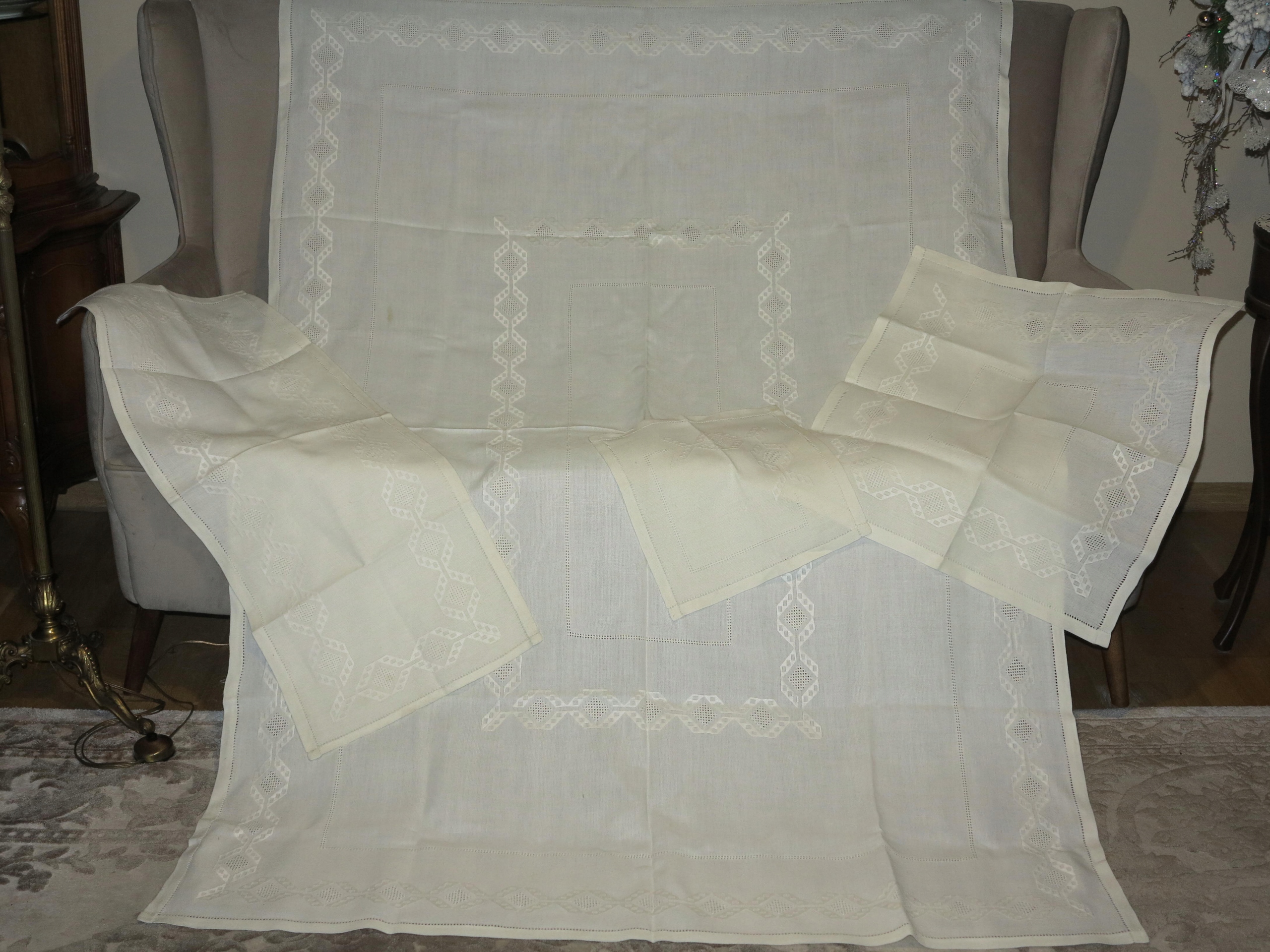 ИДЕАЛЬНЫЙ - КОМПЛЕКТ ИЗ 4-Х ЭЛЕМЕНТОВ: СКАТЕРТЬ С ТРЕМЯ САЛФЕТКАМИ. КОМПЛЕКТ УКРАШЕН МАШИННОЙ ВЫШИВКОЙ (УЗОР ПОХОЖИЙ НА ХАРДАНДЖЕРНУЮ ВЫШИВКУ) И БРИФИНГОМ. ЦВЕТ: БЕЛЫЙ КРЕМ