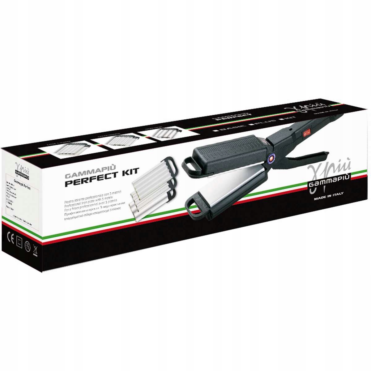 Gamma più Perfect Kit, согласно названию, идеальный набор - укладки волос. Устройство напоминает традиционный выпрямитель, но благодаря набору сменных плиток он может превратиться как в углерода, так и в инвертор. Плитка керамика, поэтому после использования волосы гладкие и блестящие.