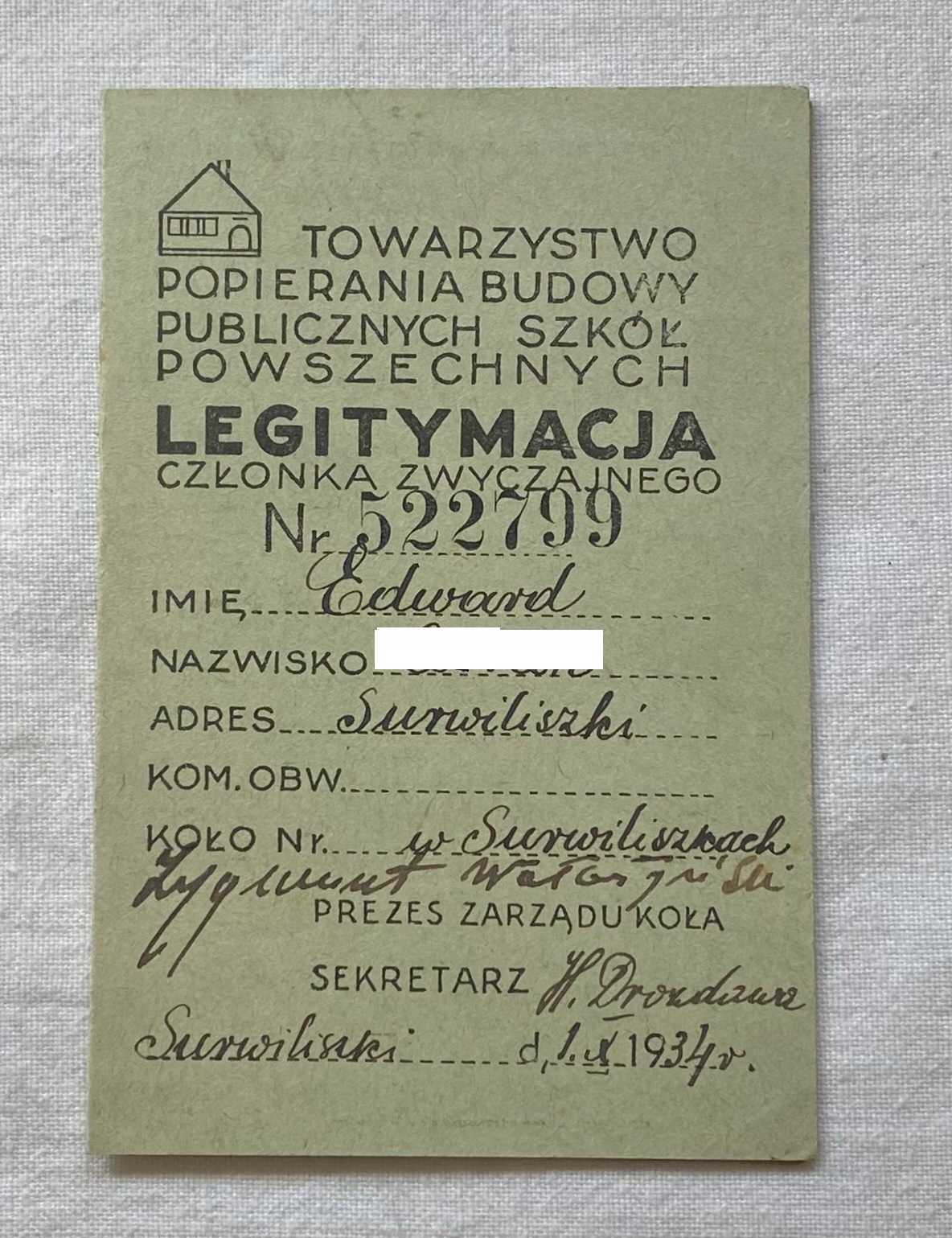 Удостоверение личности Школьного общества Surviliszki. 1934 R. BCM