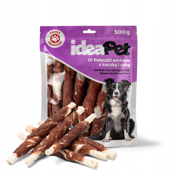 ideaPet Говяжьи палочки с уткой и рыбой 500г отличный перекус, который не только имеет приятный вкус, но также заботится о здоровье вашей собаки. Подарите своему питомцу что-нибудь особенное!