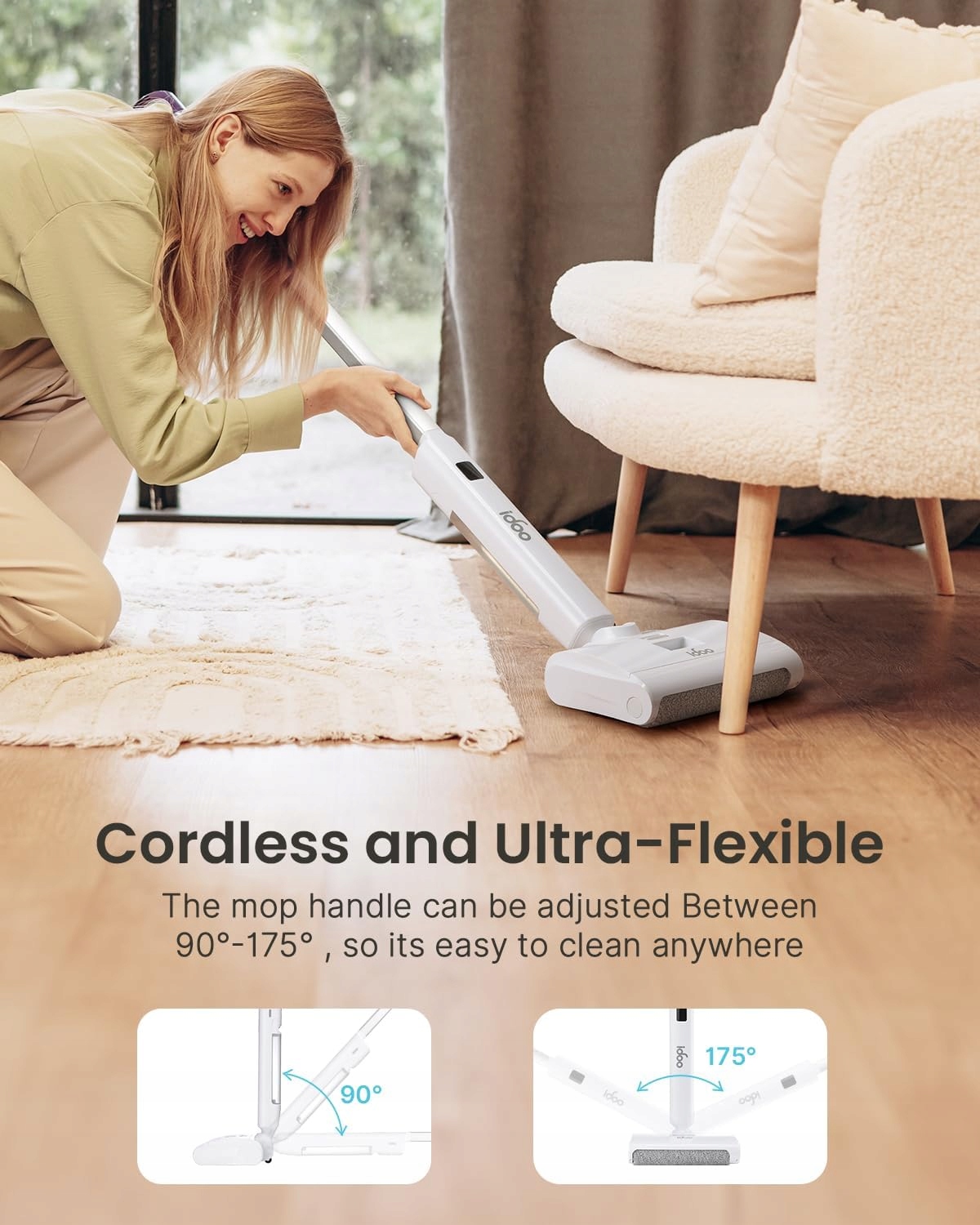 Эффективное вытирание, подметание и стирание: ИДО ЭЛЕКТРИЧЕСКОЕ ШОП для влажной и сухой чистки использует технологии, которая может одновременно чистить полы, так что вы можете удалить все типы грязи быстрее и проще. Строительство для двигателя: наша электрическая швабра для влажного и сухого пола является беспроводной и легкой (весит всего 1,5 кг) и может быть легко перемещена из комнаты в комнату. Благодаря самостоятельной функции с помощью гибкого ролика кисти и передового управления вращением (90-175 °), очистка трудных мест становится игрой в детстве