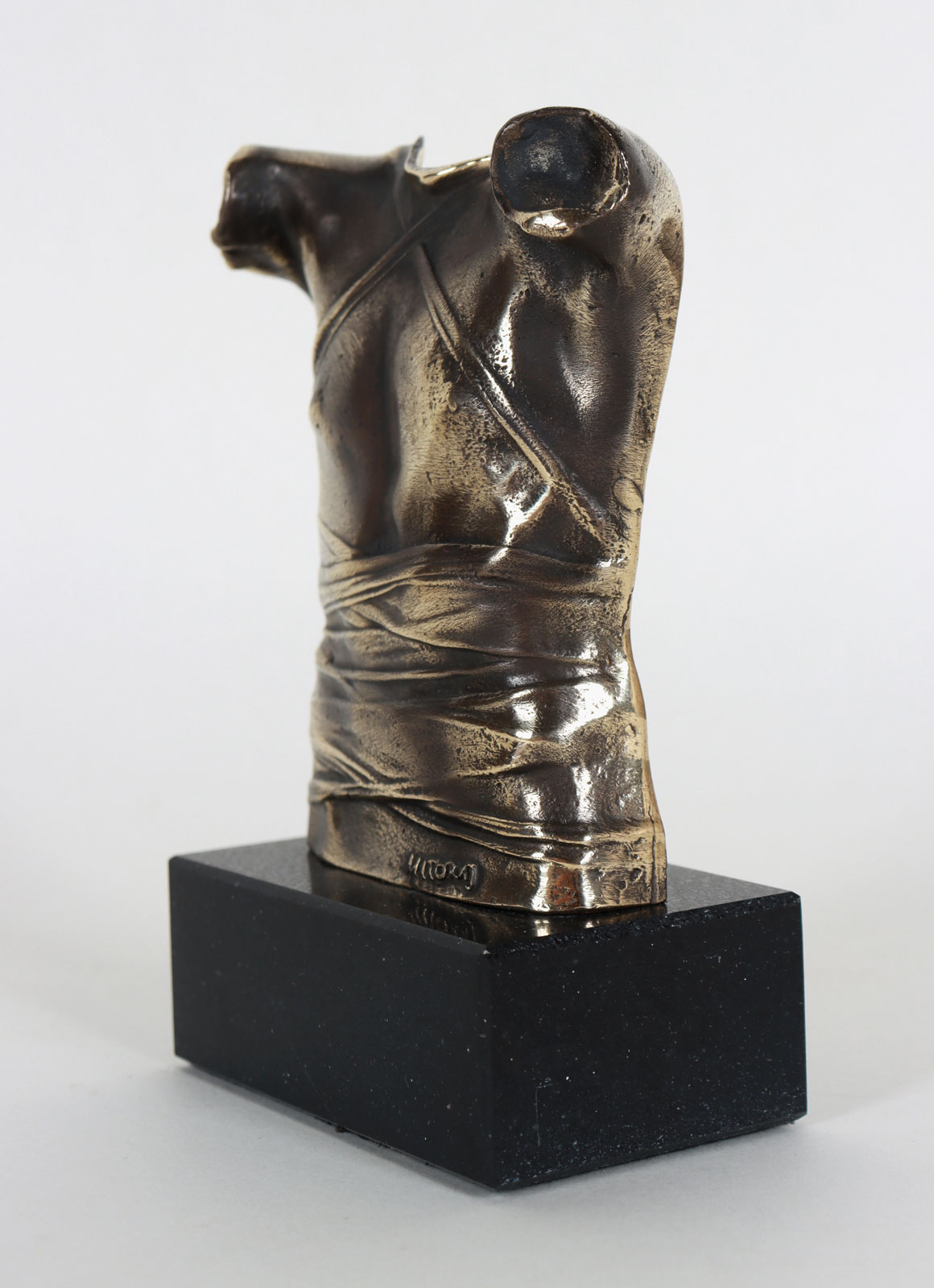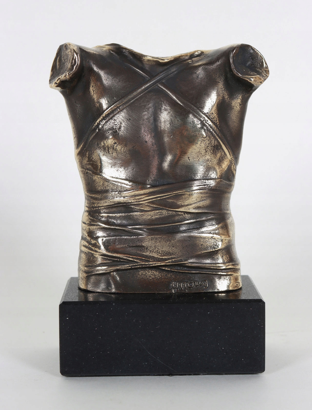 Аутентичная и уникальная работа одного из самых известных польских скульпторов - Игоря Миторая, изображающая мужской торс. От линии бедер до поднятых вверх рук показано молодое, прекрасно сложенное тело. Туловище подпоясано тонкими кусками материала, словно бинтами или ремешками, скрещенными на груди и наслоенными вокруг живота.