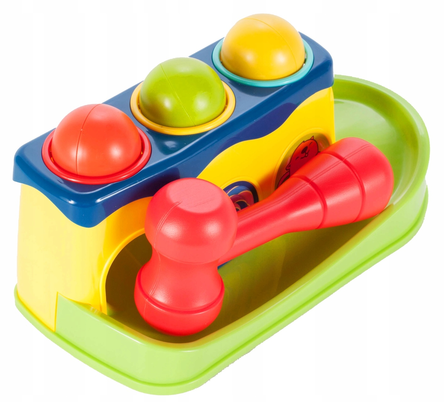 3 гремящих шарика разных цветов, которые при ударе молотком развлекут нашего ребенка различными звуковыми эффектами, а при падении в водосточный желоб побудят малыша продолжить игру. .