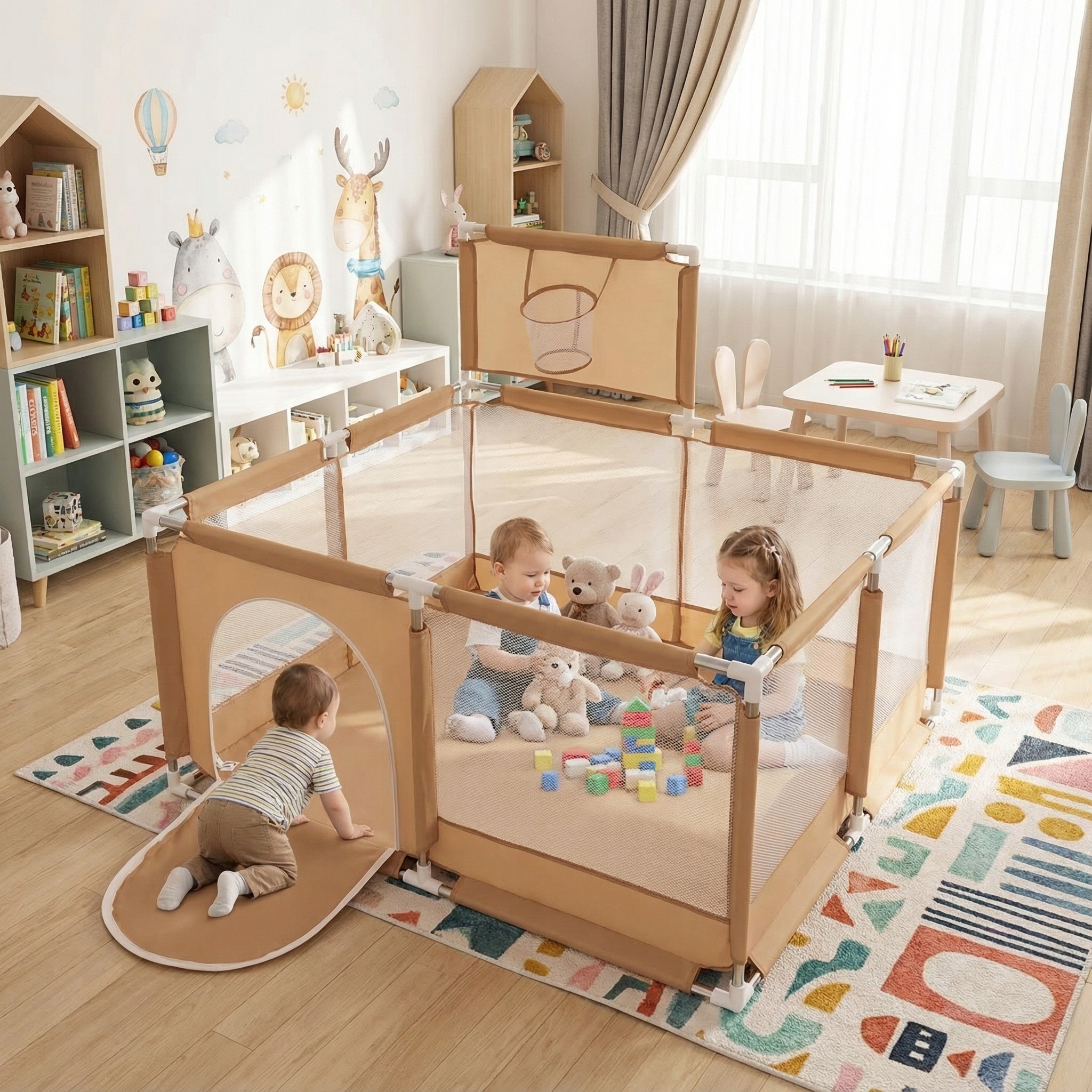 - боковые стенки из сетки позволяют наблюдать за детьми во время игры, ткань большого веса прочная и не осыпается