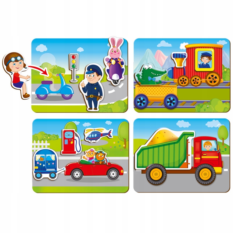 Внимательно посмотрите на игровые поля и выучите названия различных дорожных транспортных средств. Какими особенностями обладает каждый из них? Почему для езды на мотоцикле необходим шлем? Какая форма у машиниста поезда? Узнайте, сопоставляя элементы с игровыми досками, используя коленные чашечки.