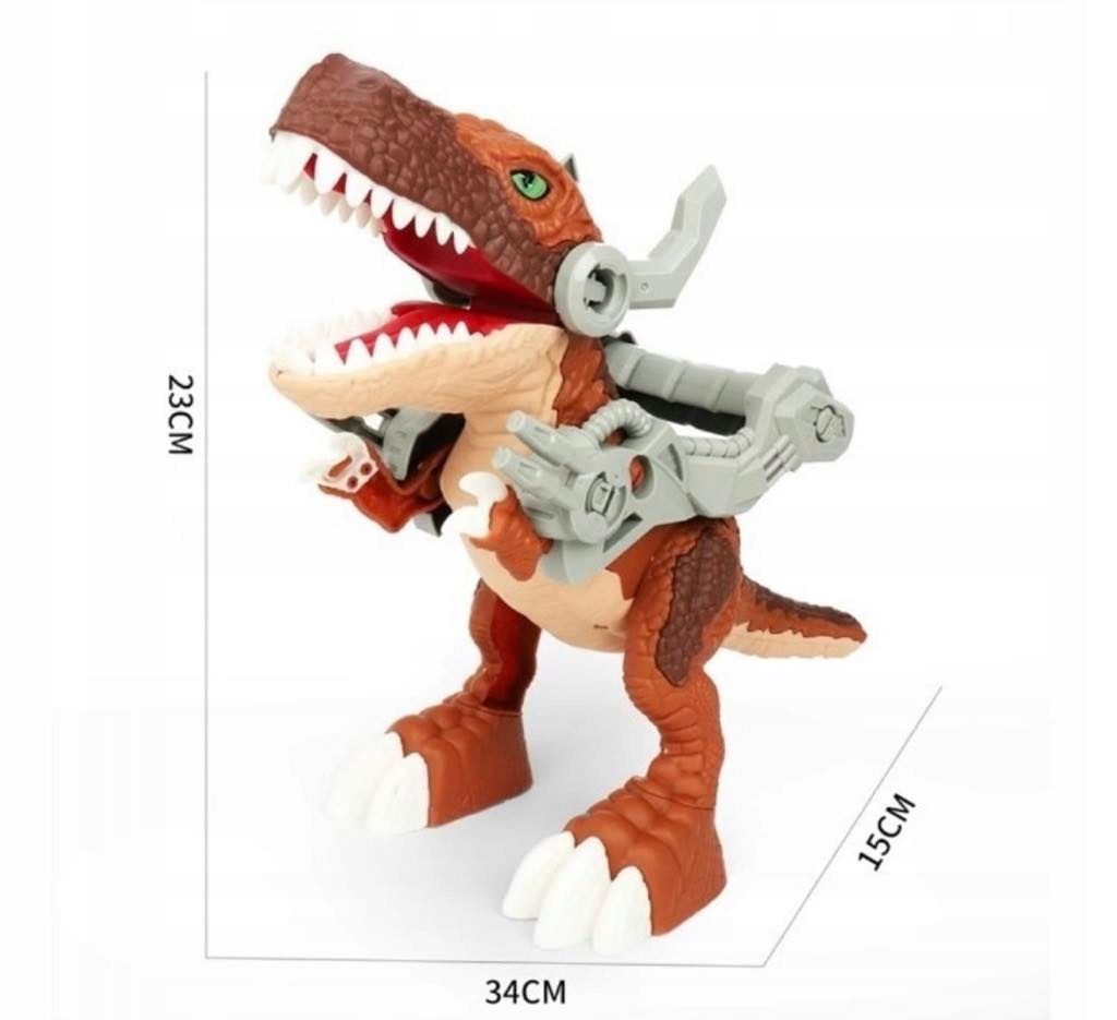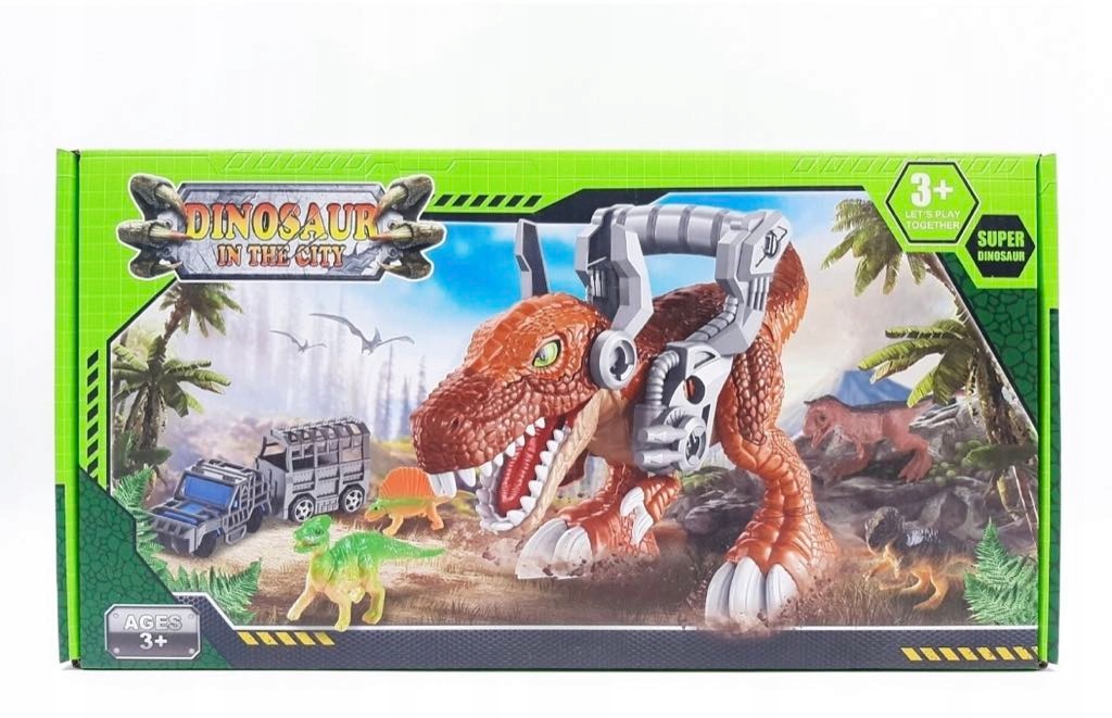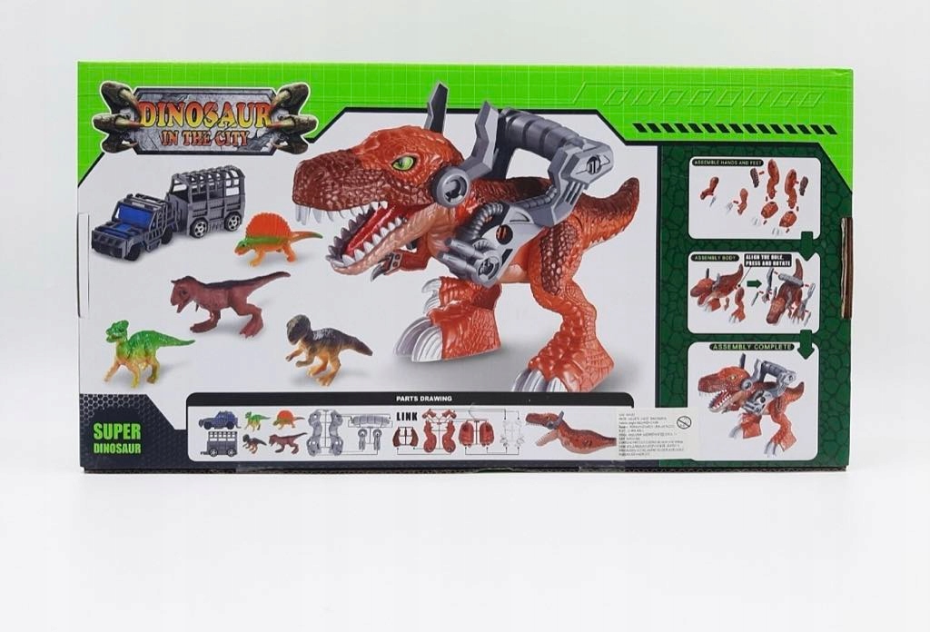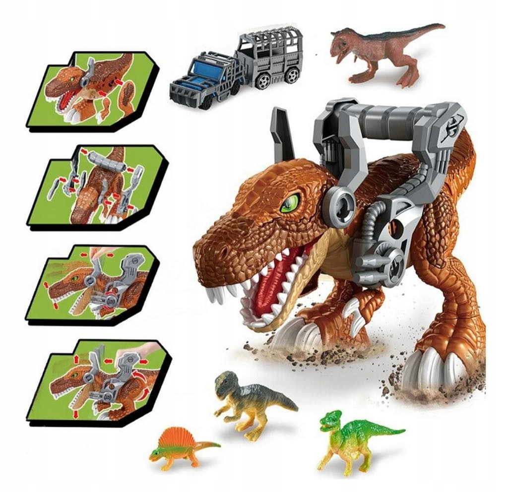 Динозавр игрушки, включенный с небольшими динозаврами и автомобилем с трейлером. Тиранозавр должен быть сложен вместе с инструкциями на упаковке этого динозавра при перемещении рычага, установленного на голове, откроет рот, чтобы он мог ловить меньшие динозавры.