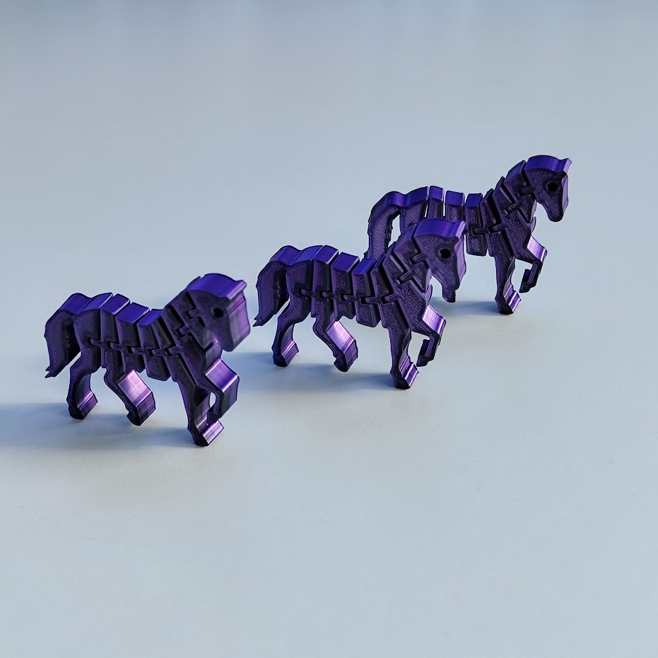Лошади изготовлены из высококачественного материала. нить из PLA пластик. Он легкий, прочный и устойчивый к падениям. Материал экологический и безопасный, нетоксичный. PLA, а точнее полилактид, представляет собой полимер, получаемый из растительного сырья, точнее из ферментированного крахмала. Обычно изготавливается из сахарного тростника или кукурузной муки.